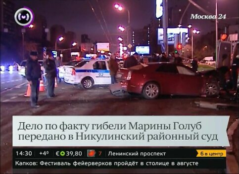 В результате аварии водитель Hyundai и его пассажирка - актриса и телеведущая Марина Голуб погибли на месте. Русаков с места преступления скрылся, и задержать его удалось только через три дня.