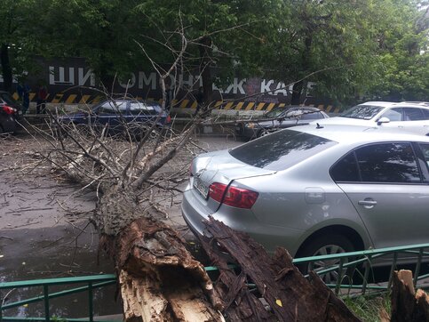 На фото хорошо видно, что дерево лежит поперек дороги и мешает проехать транспорту. Кроме того, пострадал припаркованный рядом Volkswagen.
