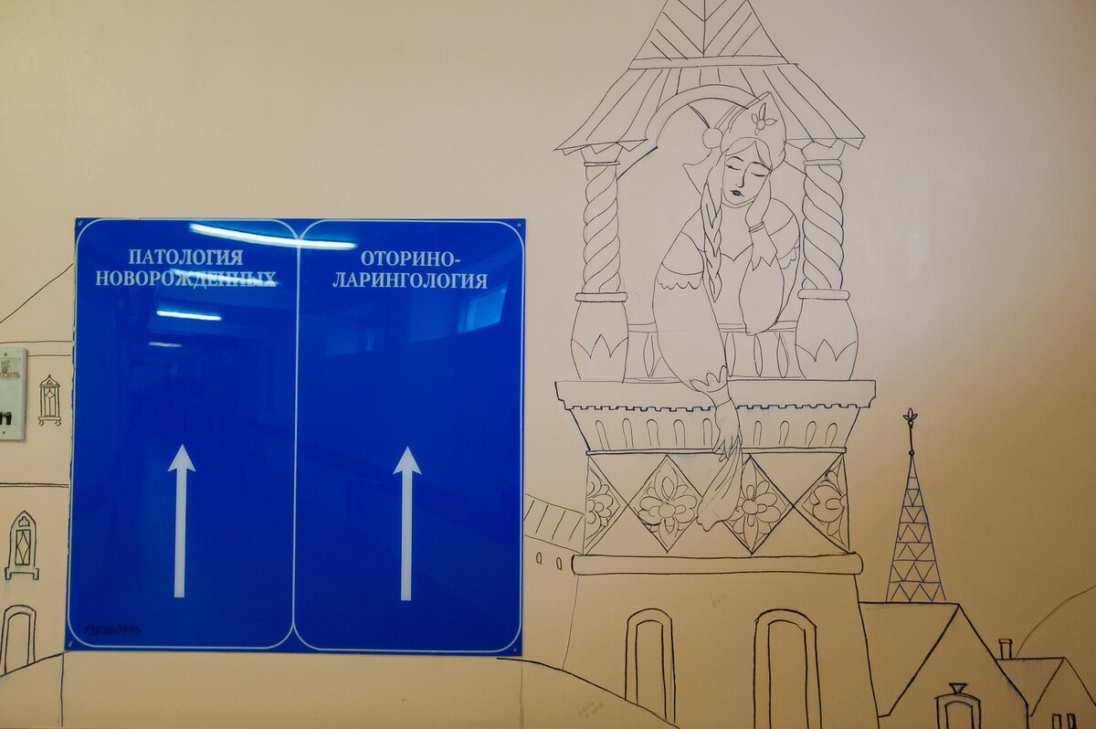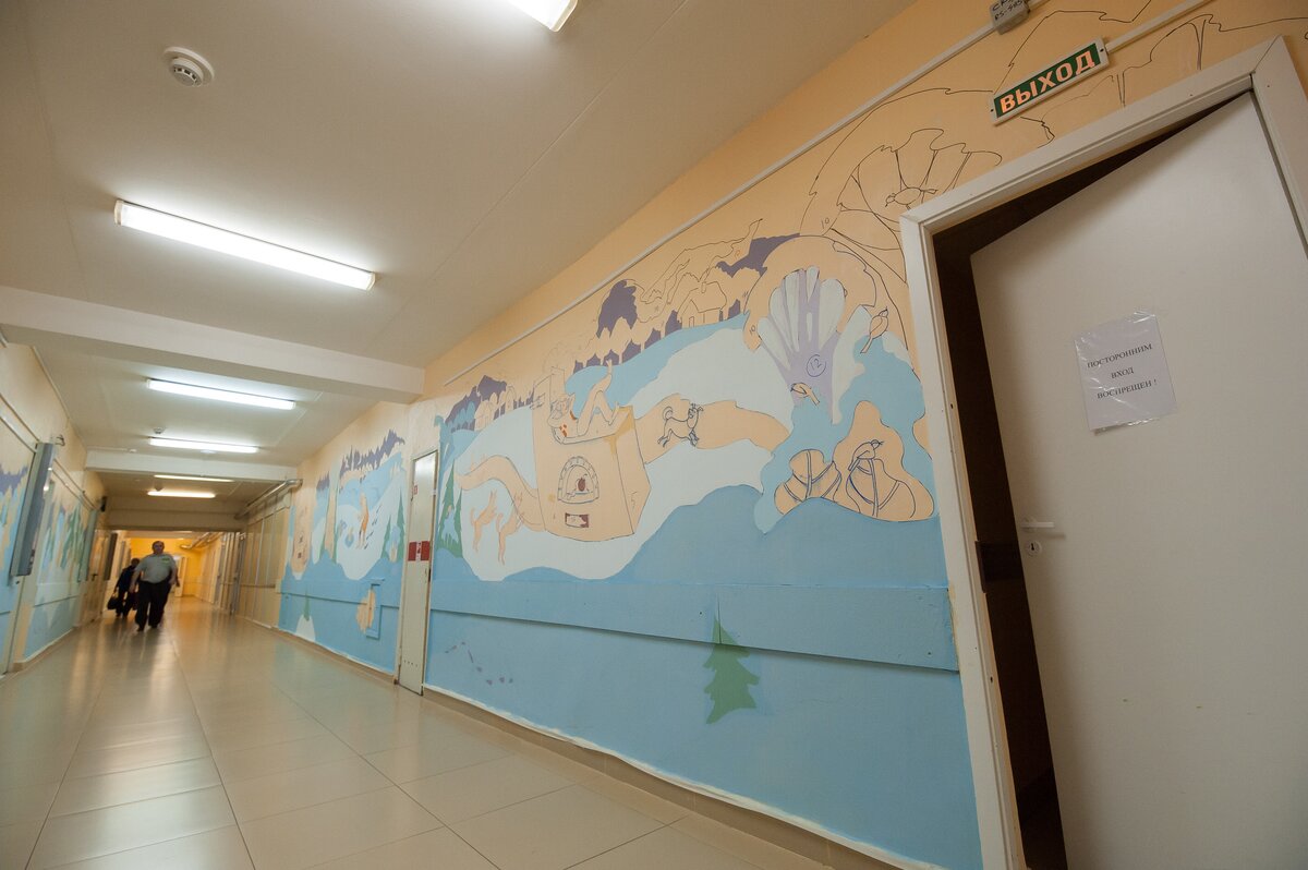 В Детской городской больнице № 7 не самая простая планировка, но пять первых волонтеров уже нашлись и ждут организатора. Все сегодня в первый раз, и более опытный организатор первым делом показывает нам фронт творческих работ. Длинный коридор, ведущий в стационар дневного пребывания и приемные кабинеты, похож на лист раскраски – маркером нарисованы Емели, девушки в сарафанах, Деды Морозы и прочие герои. Для каждого случая выбирается своя тема, на этот раз ей стали русские зимние и весенние сказки. Где-то фигуры уже раскрашены, где-то только появляются. Например, художник Ната на одной из стен сначала мелом, потом маркером рисует море и ряд богатырей – видимо, тех самых, что "в чешуе как жар горя...".