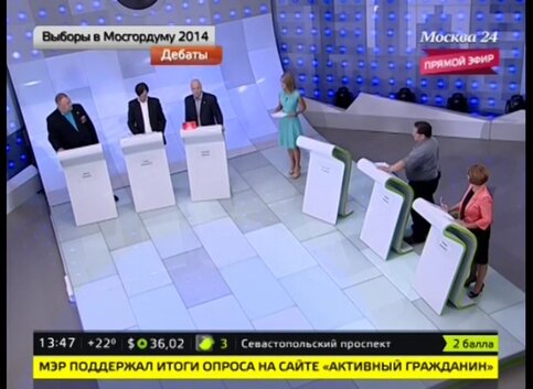 Ведущая: Итак, сейчас каждый из вас может коротко рассказать о себе, о своей программе, с которой вы идете и баллотируетесь на выборы в Московскую городскую Думу. У каждого из вас есть ровно одна минута, и вы начинаете свое выступление согласно проведенной жеребьевке.
