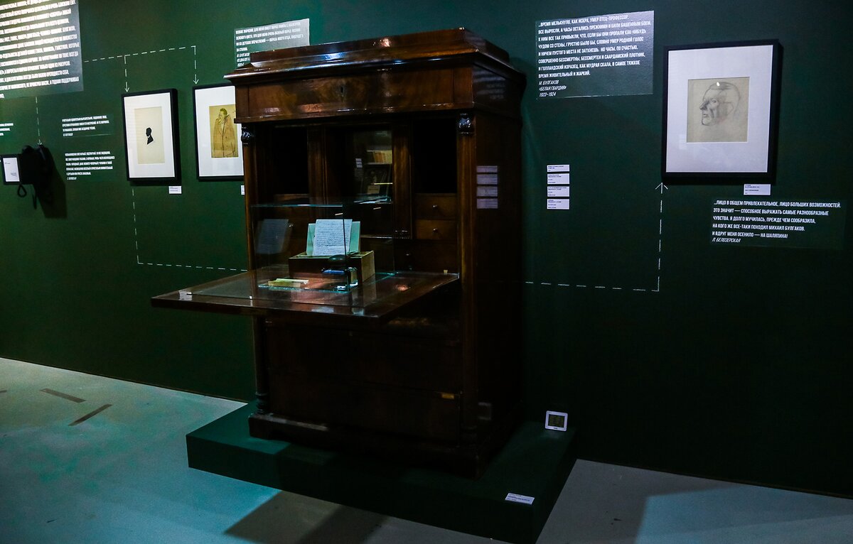 Первый зал экспозиции выполнен в виде бильярдного стола, в центре – 10 круглых витрин в форме пирамидки. То есть пять тем, и по витрине-шару на каждого писателя. Вдоль стен можно увидеть дополнительные материалы и пояснения. Создатели выставки стремились показать личности писателей не через их тексты и не через воспоминания о них, а так, чтобы казалось, будто вплотную подошел к человеку. Действительно, здесь можно увидеть совсем личные вещи – галстук и носки Маяковского, пенсне Булгакова, их рабочие столы. Сравнивая такие материалы, чувствуешь разницу между ними.
