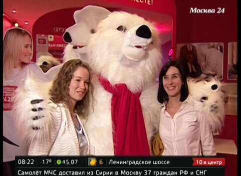 Все фотографии экспозиции нанесены на зеркала, чтобы любой желающий смог присоединиться к коллективному снимку со звездой и белым мишкой.