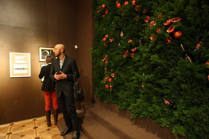 На первом этаже галереи в небольшом зале с черными стенами и двумя круглыми столами, украшенными плодами гранта, атмосфера камерная. Из динамика под потолком раздается голос Параджанова – это запись его интервью французской радиостанции. Из отрывков, перемежающихся музыкой, режиссер рассказывает о том, за что боготворит Позолини, как почувствовал артистизм Ленина, чем обернулась для него "вялость" Брежнева и почему настоящие режиссеры не выходят даже из стен ВГИКа.