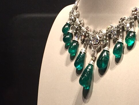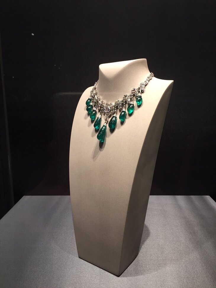 Самый роскошный экспонат выставки – колье-воротник, принадлежавшее когда-то египетской принцессе Файзе. Она была одной из первых модниц восточного мира своего времени, одевалась в лучших парижских ателье и особенно любила Коко Шанель. Файза скончалась в 1994 году, и с тех пор брошь и серьги, которые шли в гарнитуре с колье, несколько раз можно было заметить на торгах Christie's. Тперь украшение принадлежит коллекции ювелирного дома, которым оно было создано. Его уникальность заключается в чистоте изумрудов каплевидной формы: камни такого качества встречаются крайне редко.
