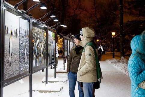 Выставка "Зимние фотоистории" открылась на Тверском бульваре в декабре. На стендах под открытым небом разместили работы московских фотографов, художников и анималистов.