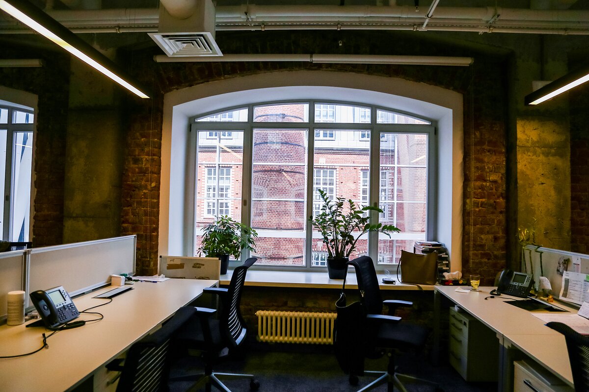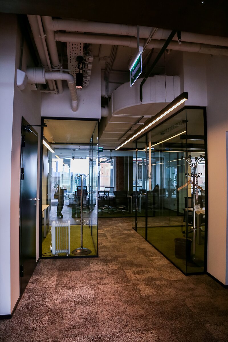 "Здесь раньше находился один из самых старых цехов фабрики, – рассказала офис-менеджер Анастасия Рыжова, – Когда мы только смотрели помещение, было намного темнее, и еще сильнее ощущалась старина. Из этого ощущения и выросла идея офиса как музея. Мы не стали красить или чем-то закрывать кирпич, а просто накрыли его стеклом, оставив на обзоре, как в витрине. Открыли несущие бетонные конструкции."