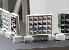 Московский уличный художник под ником 0331с представил в галерее XL свой проект – 133 фарфоровых копии бетонных блоков забора, которым обносят строящиеся объекты.