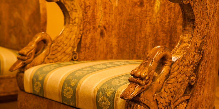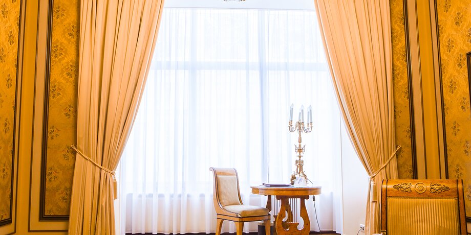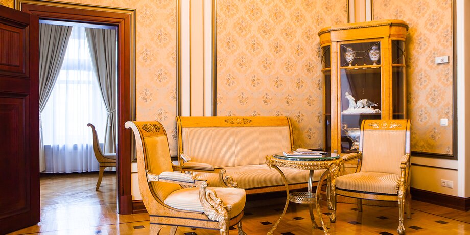 На третьем этаже есть знаменитая "Золотая гостиная" – здесь можно увидеть мебель из дорогой карельской березы. посмотрите, какой изящный стол с кариатидами. В то же время, у нас есть и обычная мебель, и копии картин. Вспоминается случай, когда мне в выходной день позвонили с ресепшена и спросили: "Картина "Запорожцы пишут письмо турецкому султану" оригинал или копия?" Конечно, это копия. "Ну хорошо, а то у нас гость переживает, говорит, что год назад в Турции подлинник купил, а тут такую же видит", – сказали мне.