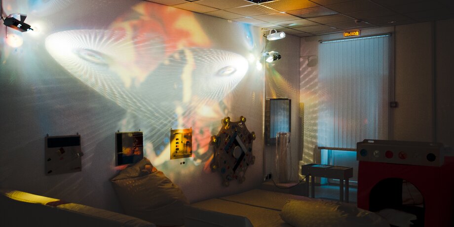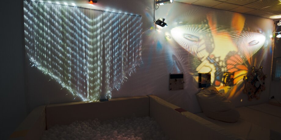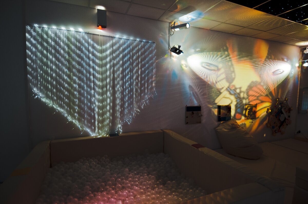 В сенсорной комнате ребенок может отдохнуть и получить психологическую разгрузку. Там приглушен свет, можно получить приятные телесные, звуковые и световые ощущения. Сначала ребенок может полежать в сухом бассейне из шариков, потом посмотреть на звездное небо, порисовать песком на столе, посмотреть на панель с водопадом. Здесь есть специальные панели, на которых можно потрогать разные поверхности из шерсти, пластика, металла, камней. Это нужно для детей, которые совсем не видят.