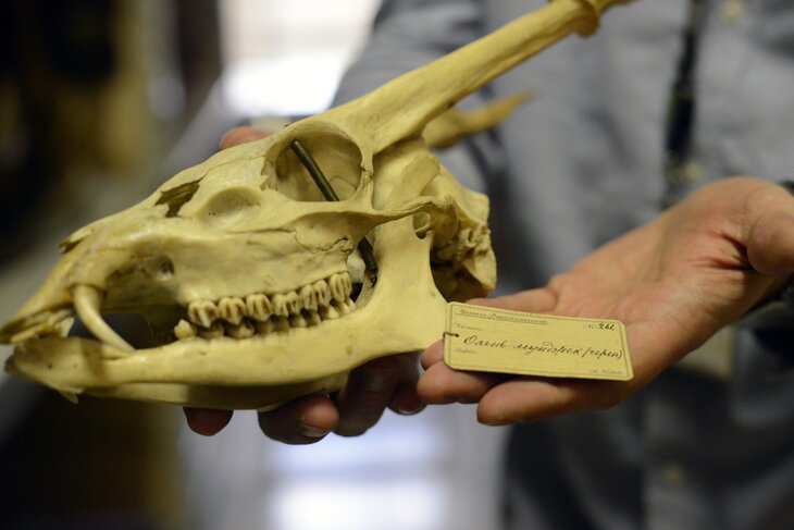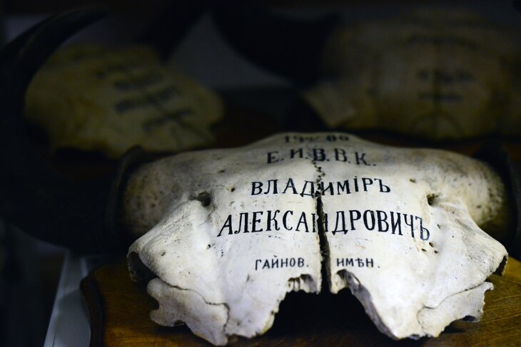 "В другой комнате у меня хранятся рога, это остеологическое хранилище (остеология – отдел науки, который занимается изучением костей и скелетов – M24.ru). Эта коллекция помимо экспозиционного и научного значения имеет огромную историческую важность. На лобных костях трофеев, рогах убитых животных, есть надписи. Буква “Н” с двойкой и короной – это то, что Николай II добыл лично. Многие экспонаты были добыты братьями, друзьями и гостями царя.