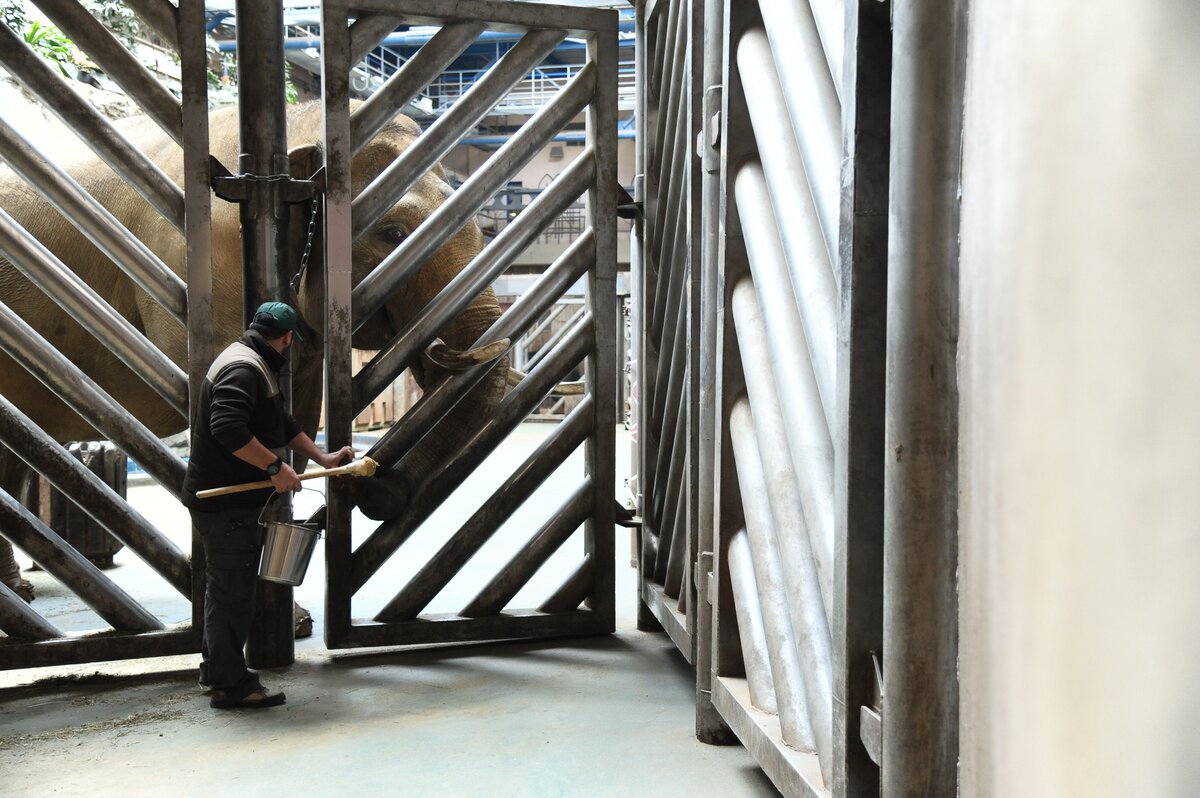 – Самцы не особо любят, когда их чешут и гладят. Это больше девочки. Я чешу их щеткой или просто глажу. Самца могу за хобот подержать или ушко ему погладить. Еще у нас есть специальное металлическое окно в вольере, через которое мы чистим слонам ноги. Памир очень любит эту процедуру.
