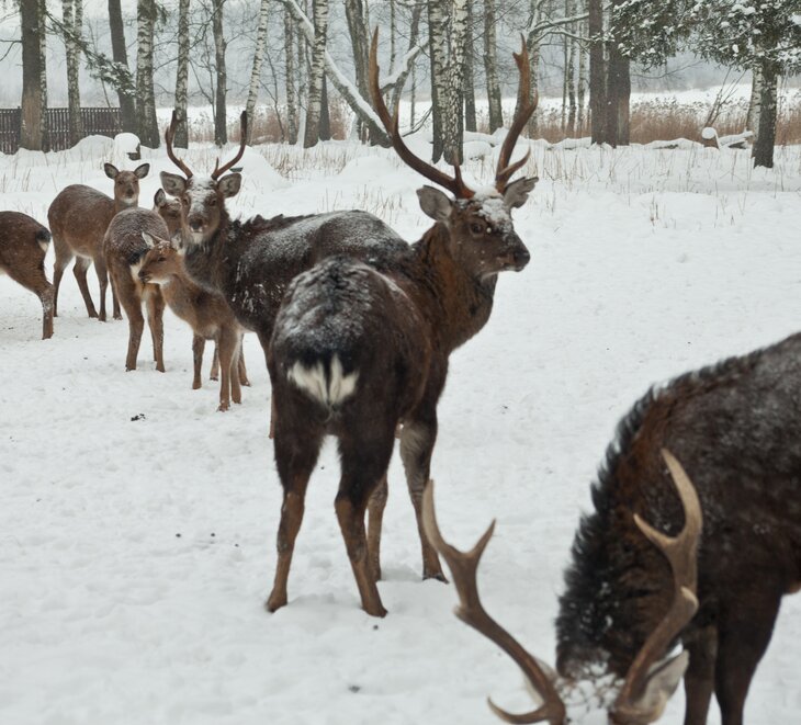 В "Лосином острове" живут не только лоси, но и пятнистые дальневосточные олени. В 1984 году в районе Абрамцево были выпущены в лес всего 24 особи, а сейчас их поголовье составляет больше 200. В зимний период, когда труднее добыть пищу, олени держатся семьями примерно по 20 голов, во главе которых крупные самцы – вожаки. Их легко вычислить: если кинуть стае лакомство, первым к нему подпустят главу семейства.
