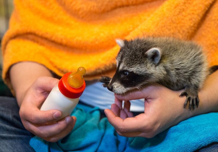 Месячных малышей кормят козьим молоком из бутылочки шесть раз в день. Такой режим питания будет сохраняться, пока енотам не исполнится 2,5 месяца.