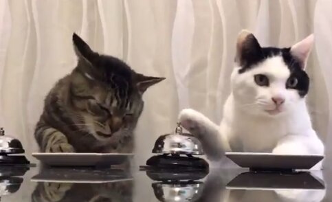 На кадрах двое котов нажимают на кнопку звонка, после чего хозяин приносит им еду. Когда они съедают свою порцию, снова нажимают на кнопку, чтобы им принесли добавку.