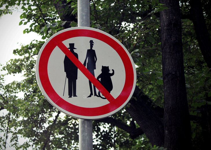 Знак "Запрещено разговаривать с незнакомцами" на Патриарших прудах снова украли. На нем изображены силуэты героев романа Михаила Булгакова "Мастер и Маргарита" — Воланда, Коровьева и Бегемота, перечеркнутые красной линией. Исчезает он уже восьмой раз.