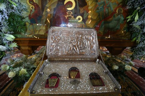 В самом храме никто не стоит - у святыни просят не задерживаться. А прикладываться к ней нужно не губами, а рукой. Посмотреть святыню можно до 13 января.