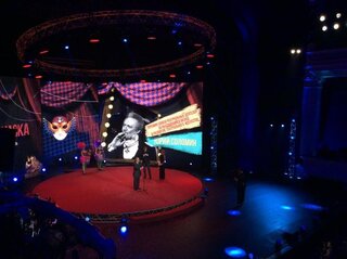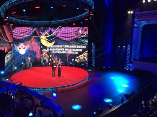 Оба ведущих – с клоунским гримом – приглашают на сцену директора фестиваля-премии Марию Ревякину.