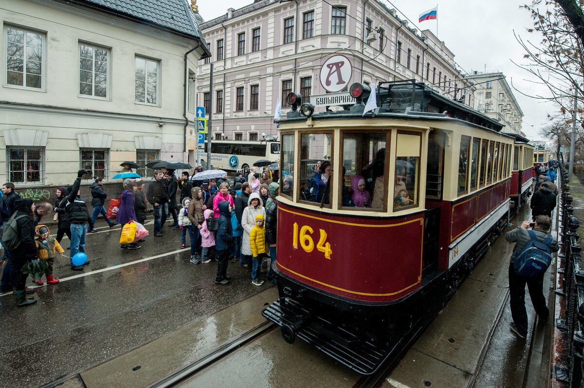 Ежегодный праздник московского трамвая прошел 16 апреля на Чистых прудах. Там развернулась выставка уникальных трамвайных вагонов разных эпох, включая запряженную лошадьми конку XIX века.
