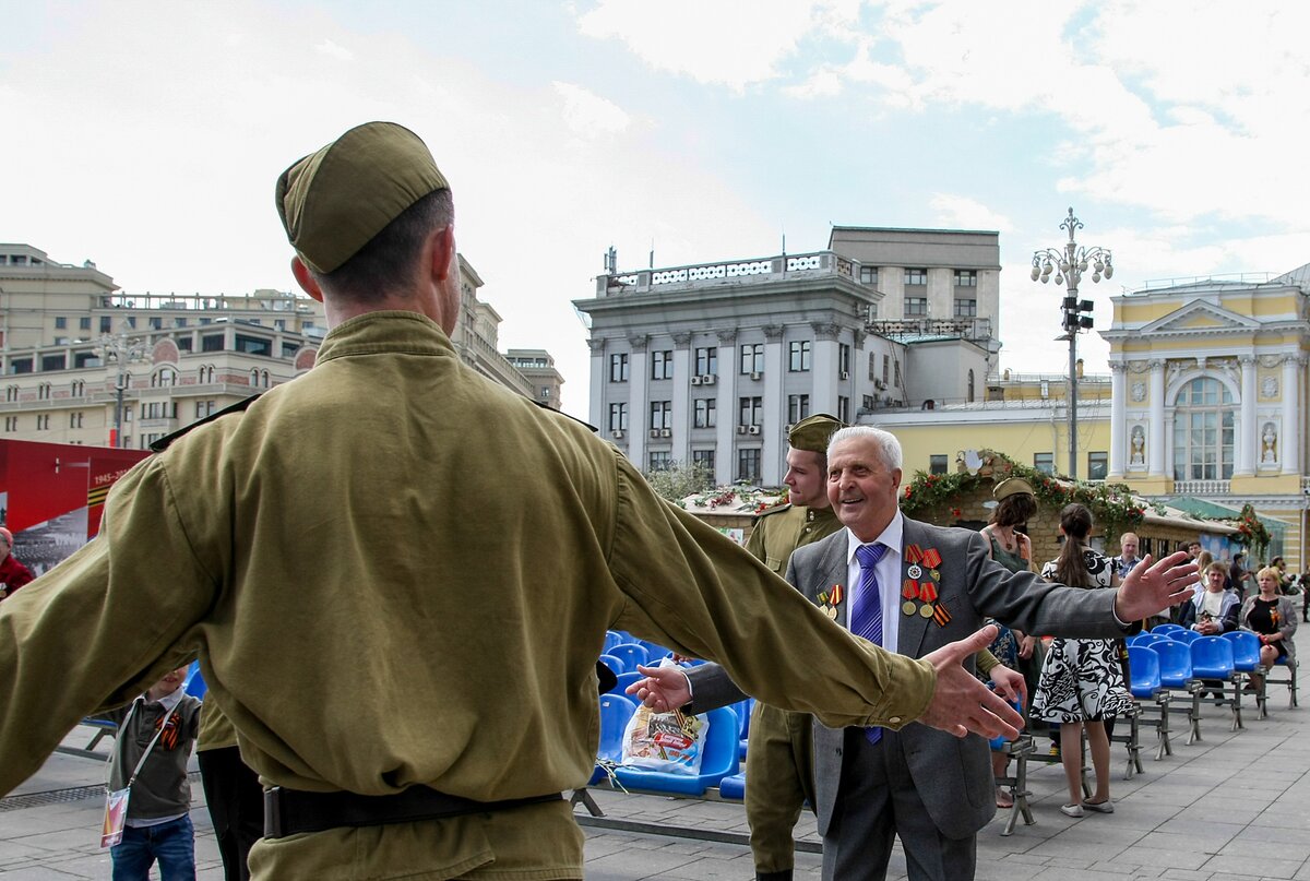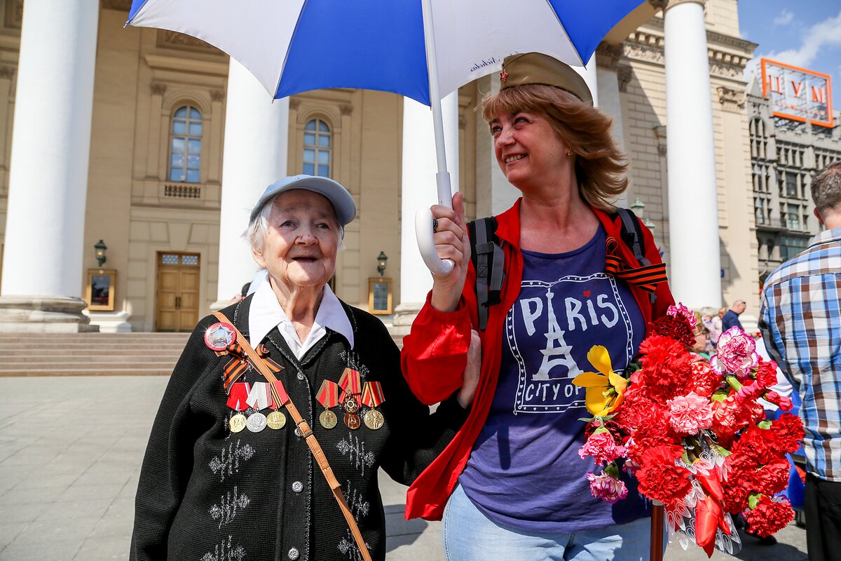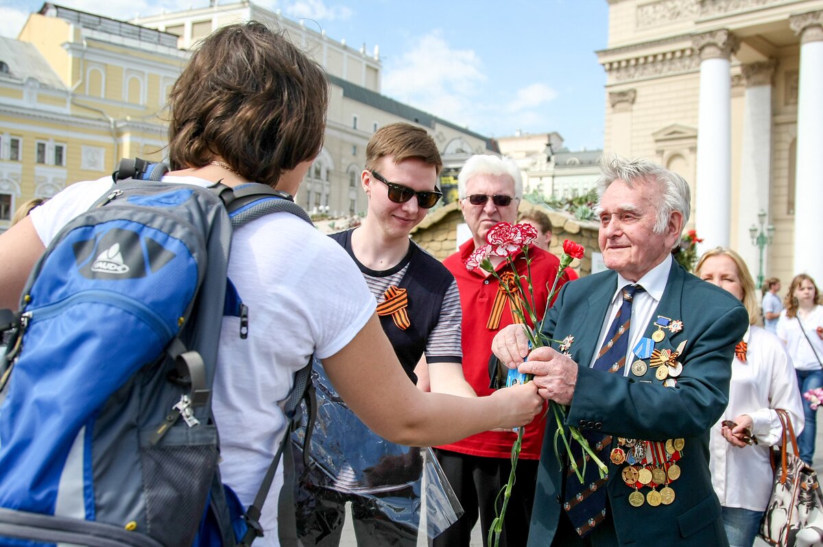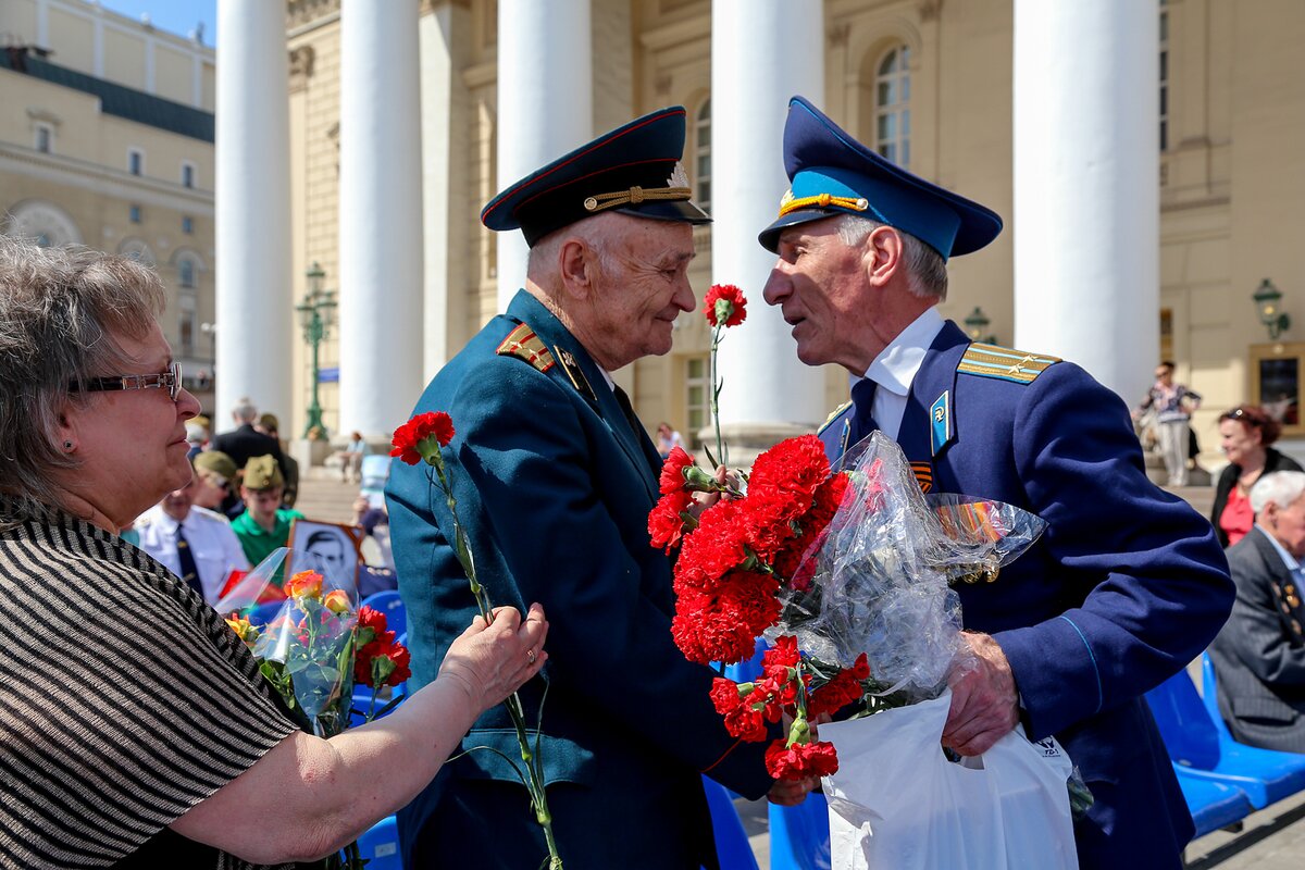 Ветераны Великой Отечественной войны по традиции собрались у Большого театра. Многие пришли на Театральную площадь вместе со своими внуками. Ветераны встретились с однополчанами и спели песни военных лет.