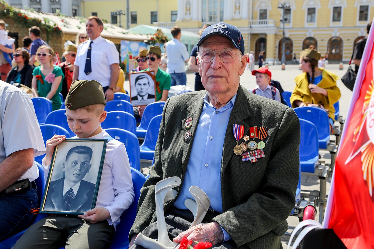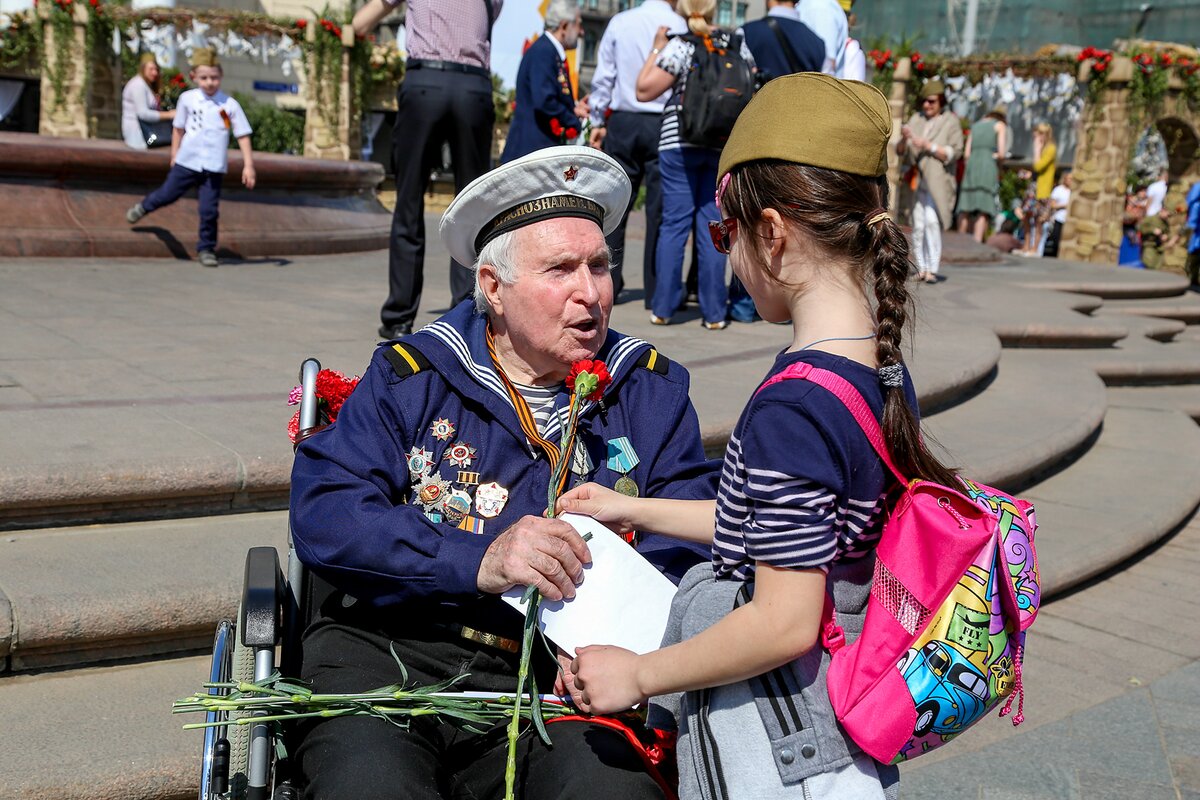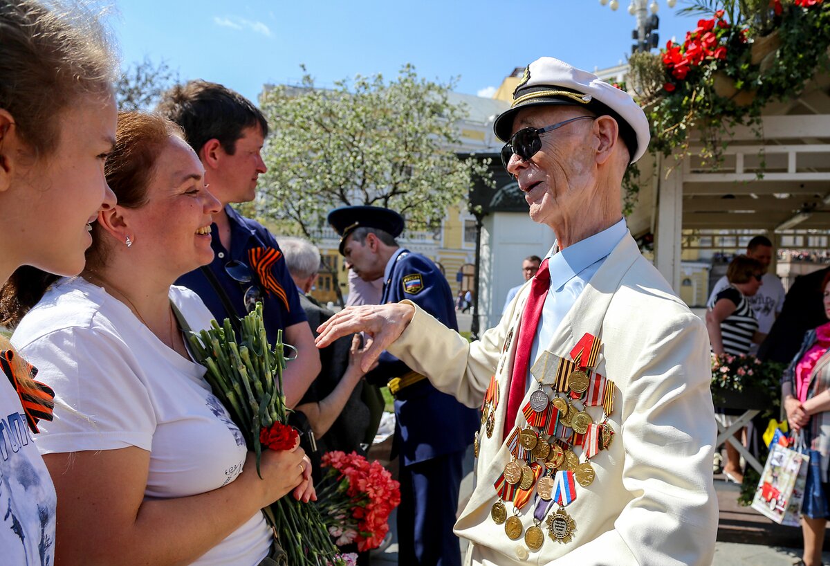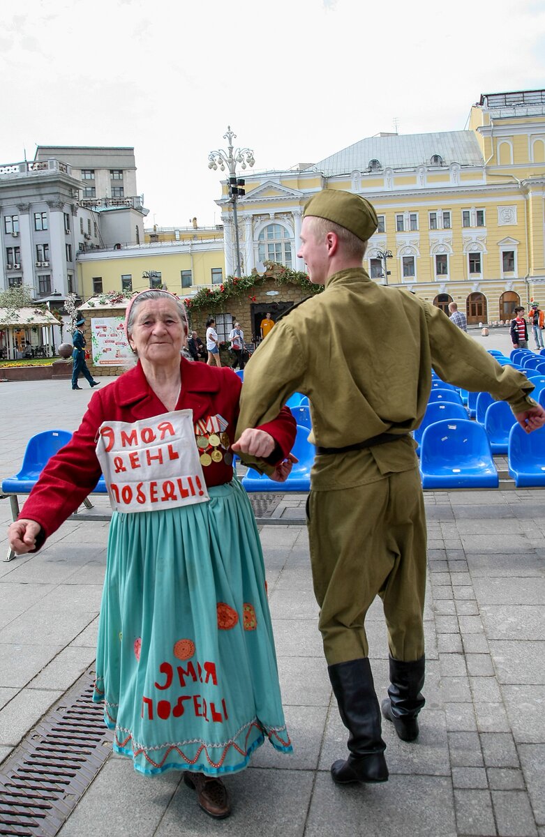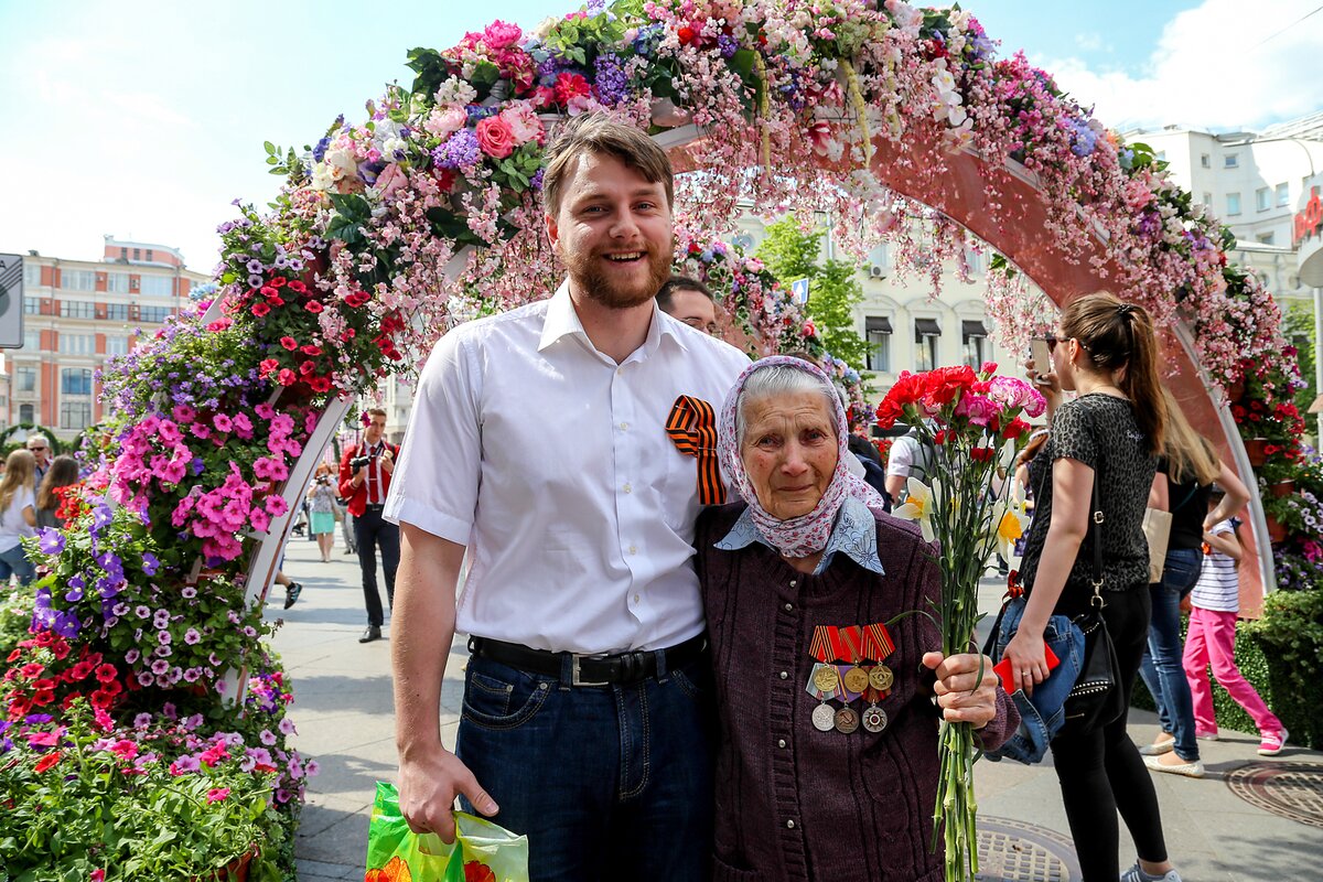 Ветераны Великой Отечественной войны по традиции собрались у Большого театра. Многие пришли на Театральную площадь вместе со своими внуками. Ветераны встретились с однополчанами и спели песни военных лет.
