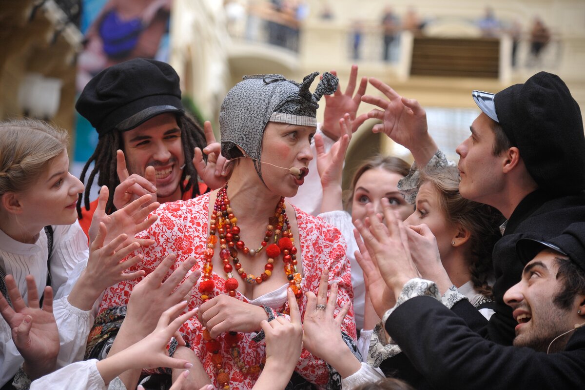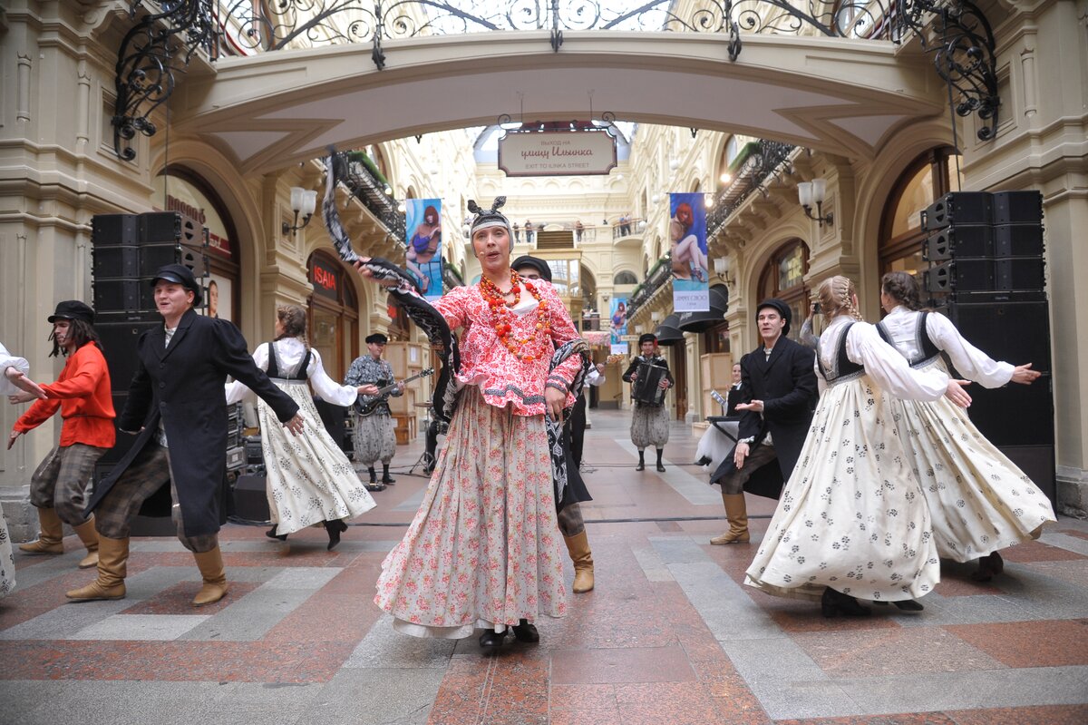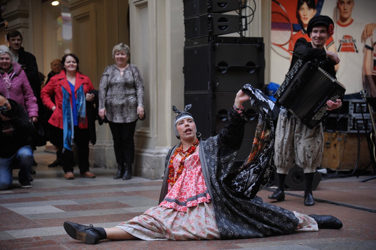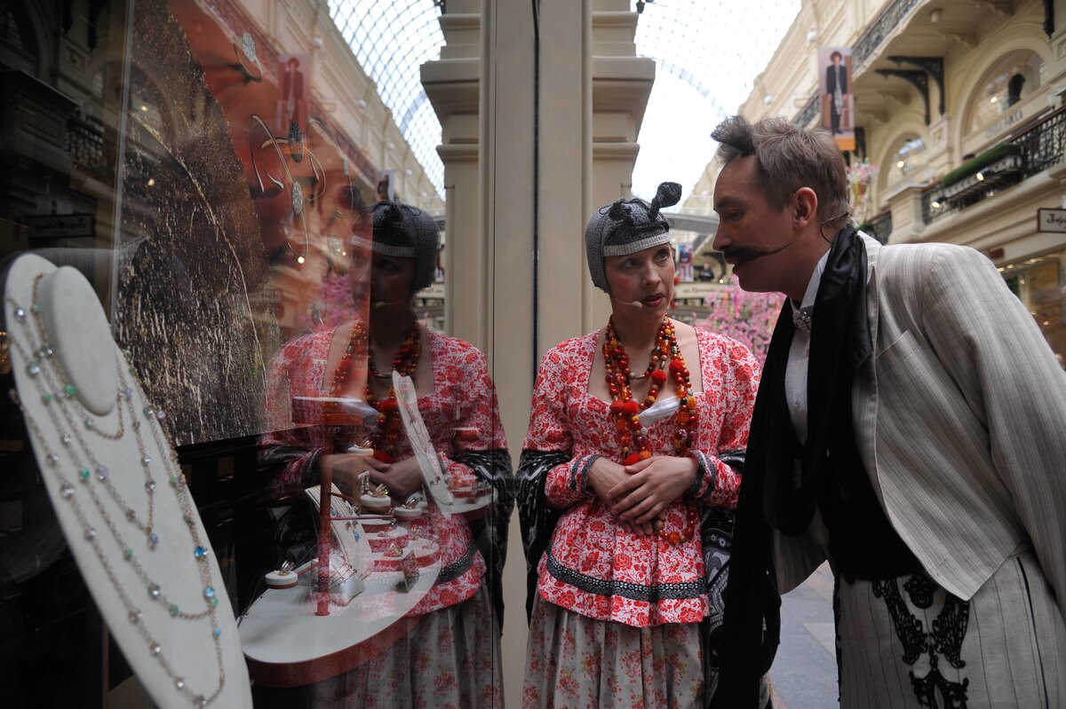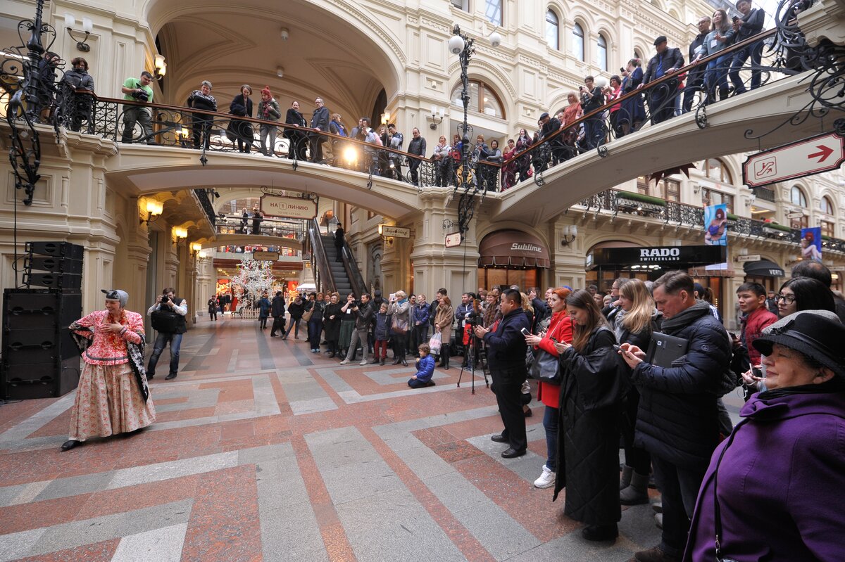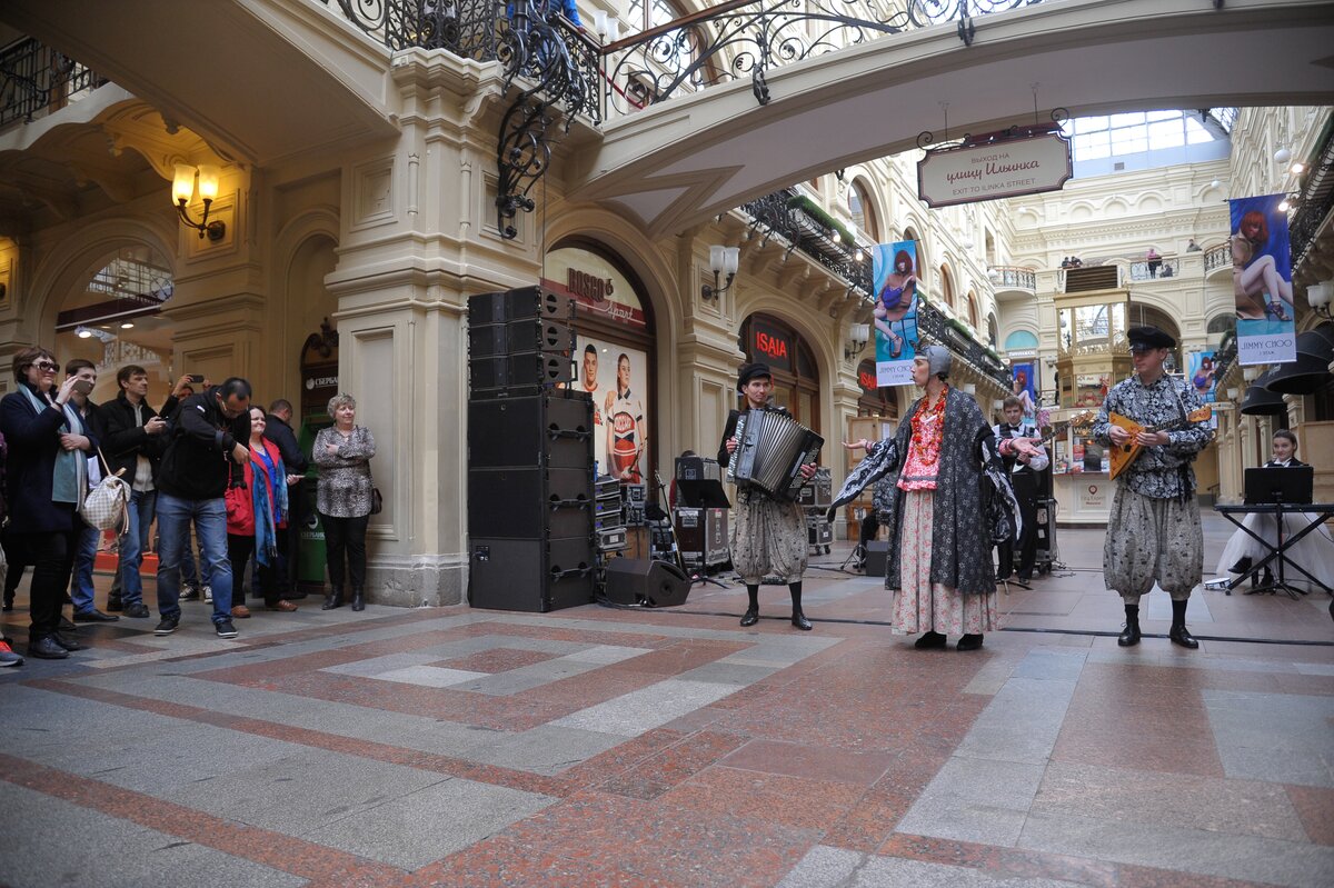 5 апреля в рамках "Золотой Маски в городе" в ГУМе выступила группа артистов Пермского Театра-Театра. Были исполнены несколько музыкальных номеров из спектакля "На всякого мудреца довольно простоты". В программе этого эпизода также очередной перформанс артистов компании "Яркие люди".