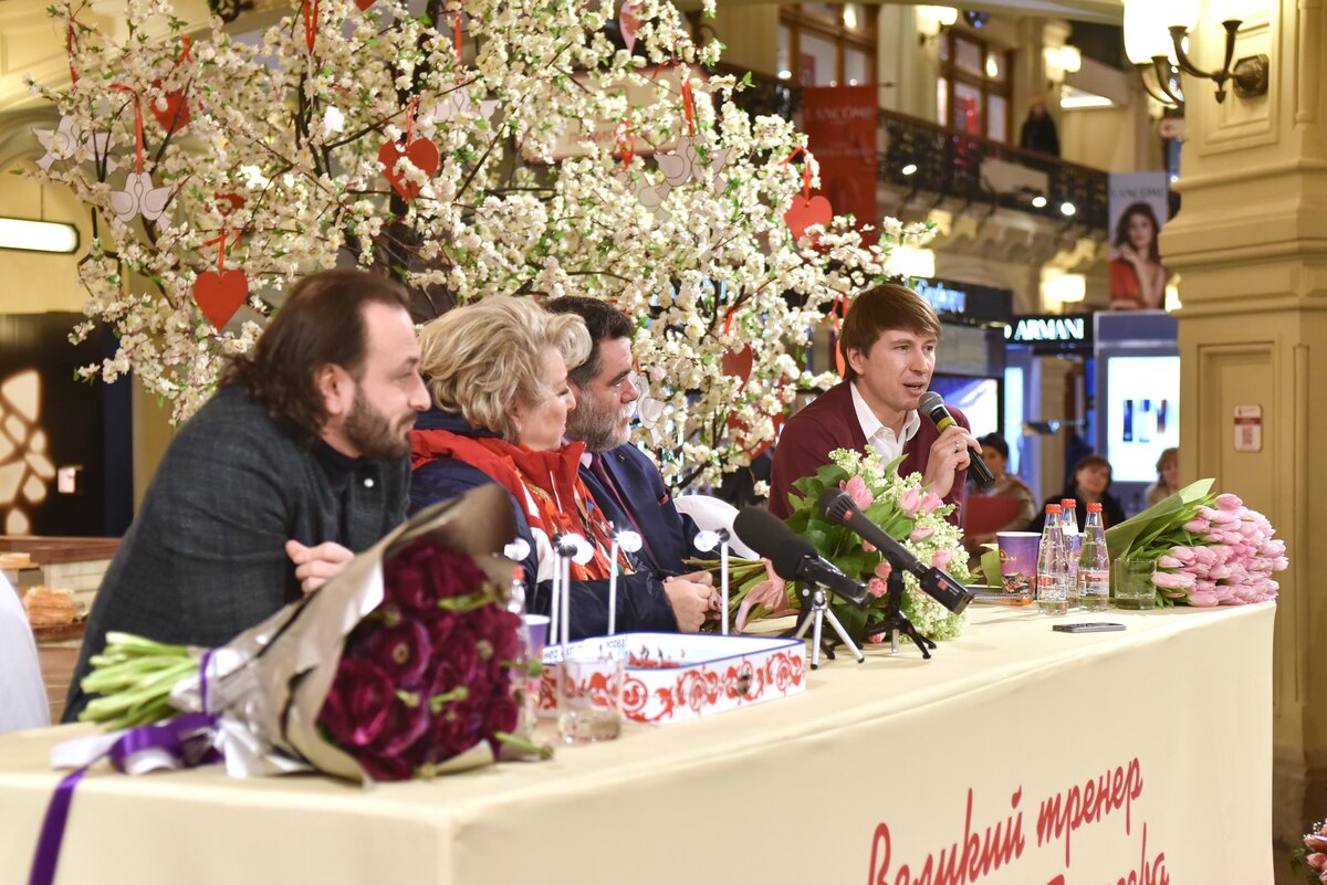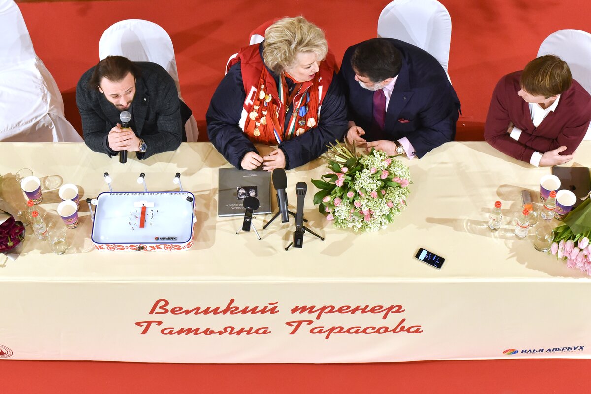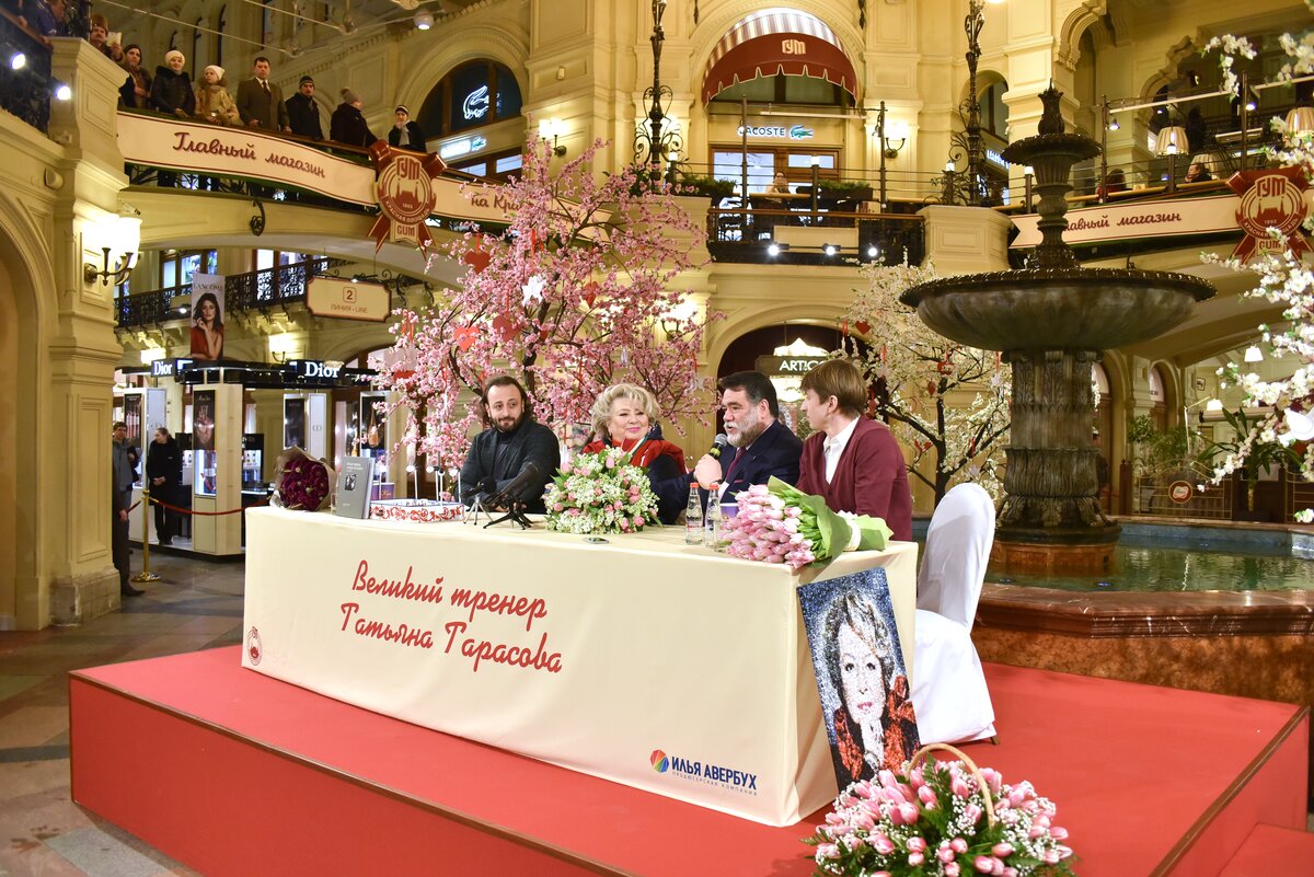 Советский и российский тренер Татьяна Тарасова отметила юбилей на ГУМ-Катке. Сначала в ГУМе у фонтана состоялась пресс-конференция Татьяны Тарасовой, в которой также приняли участие режиссер-постановщик ее юбилейного шоу Илья Авербух, Михаил Куснирович и фигурист Алексей Ягудин.