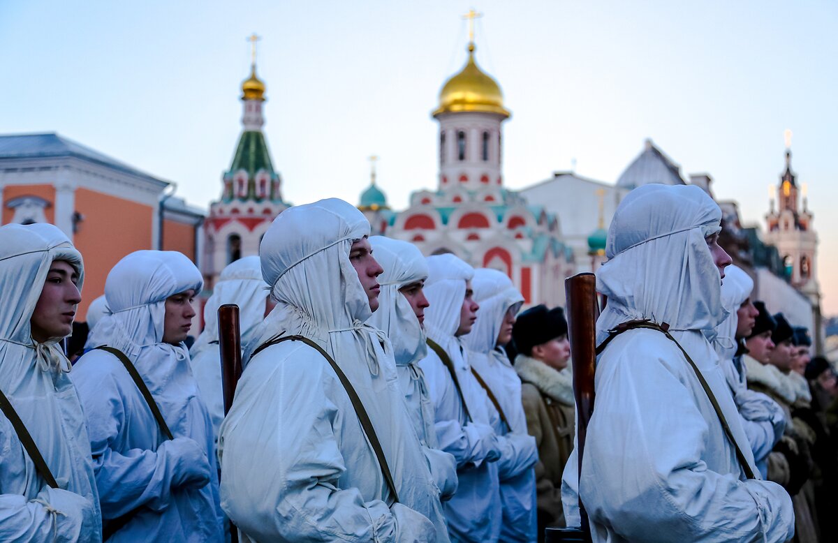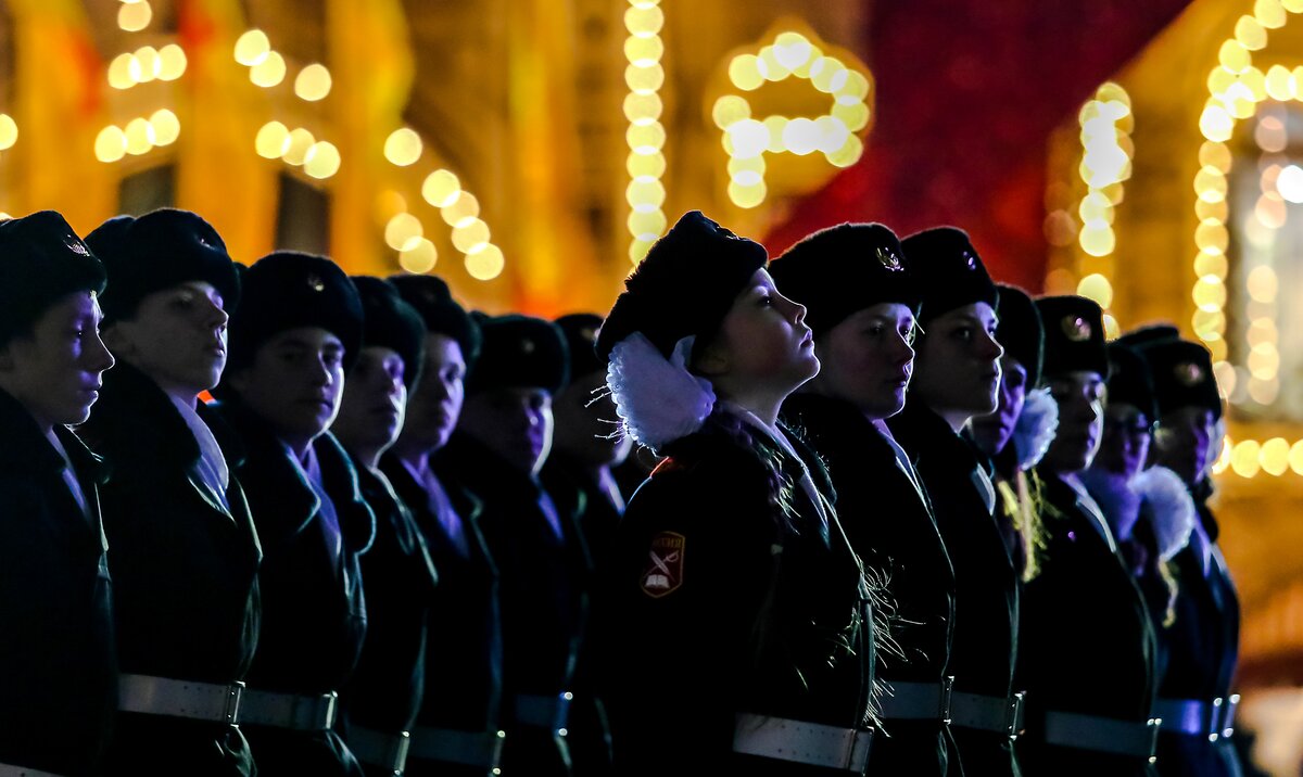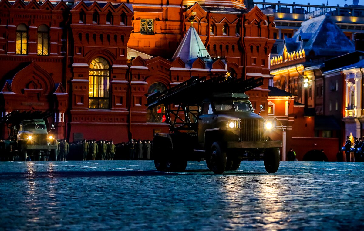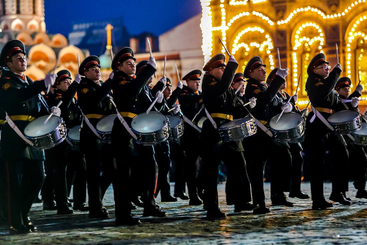 Под музыку по Красной площади прошли курсанты кадетских училищ, воспитанники Суворовских училищ, Московского военного музыкального училища. На экранах транслировали хронику военных лет.