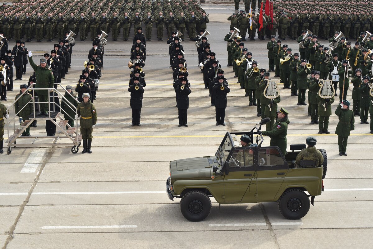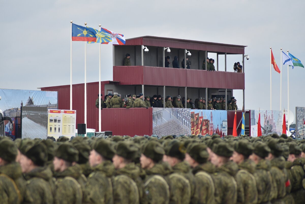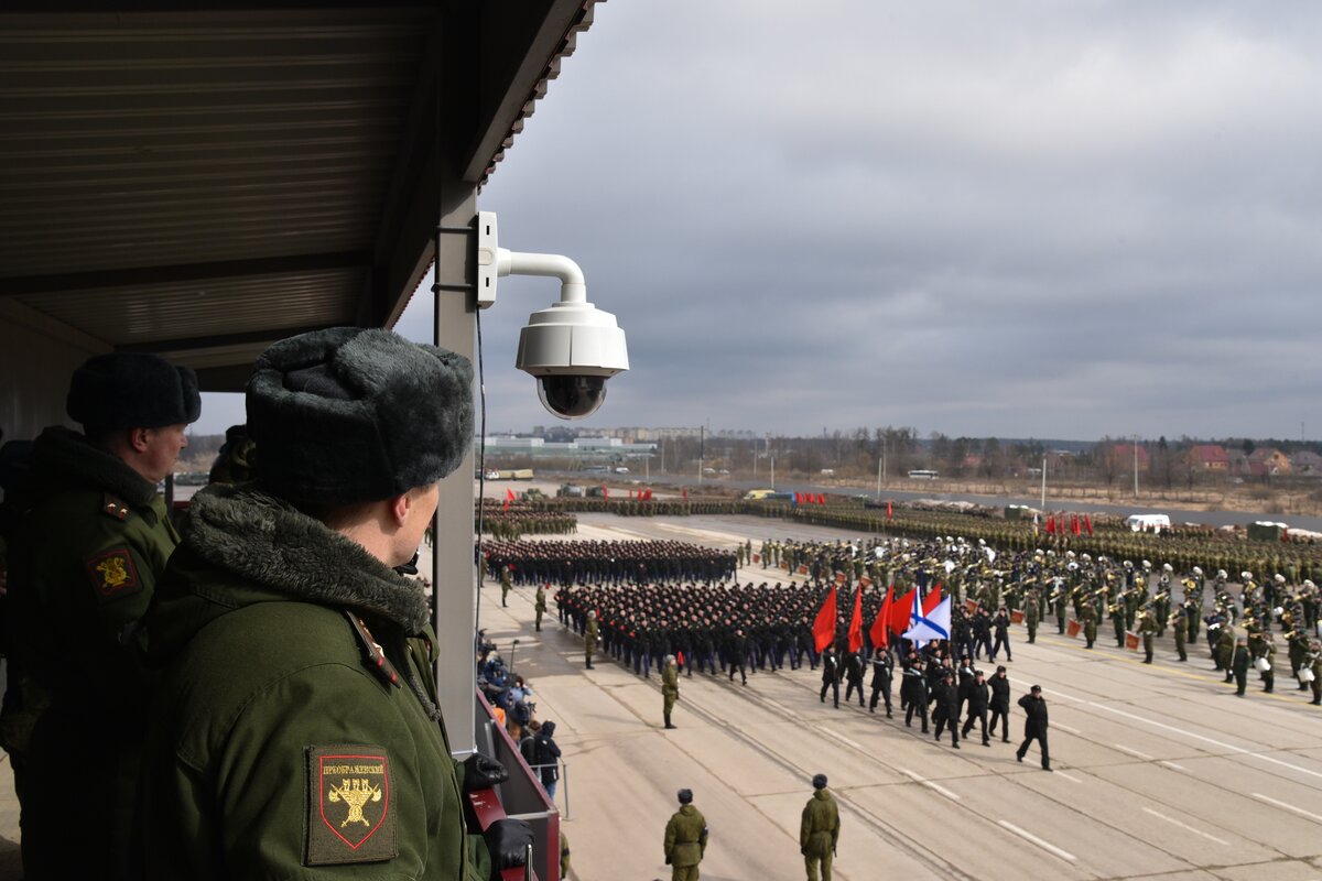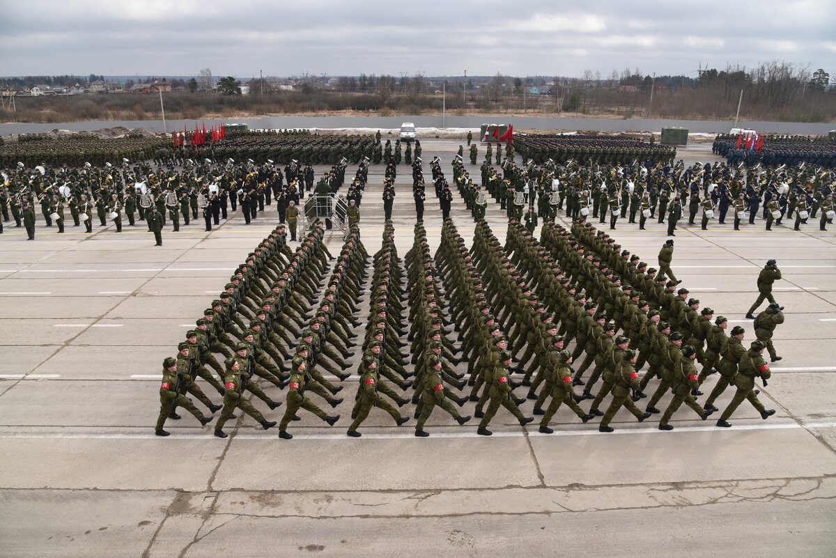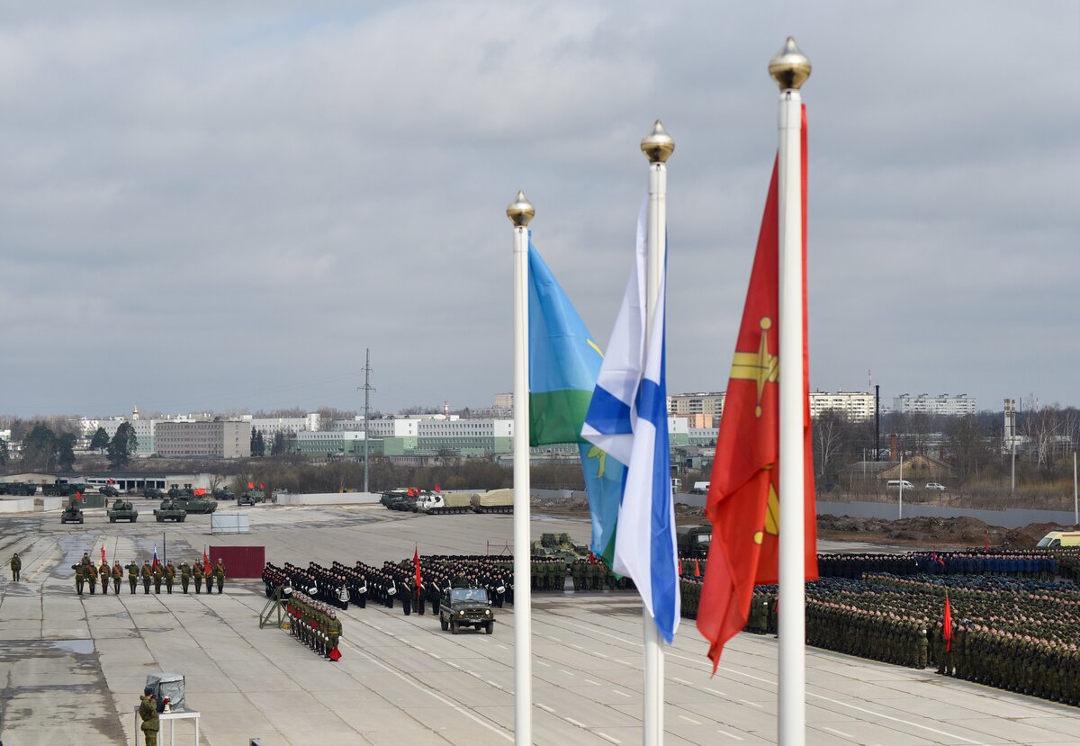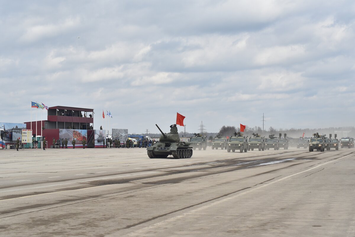 На подмосковном полигоне Алабино прошла тренировка парада Победы. В репетиции приняли участие более 10 тысяч военнослужащих и более 100 единиц современной военной техники, в том числе автомобили "Тигр", бронетранспортеры БТР-82А, танки Т-90А, самоходные гаубицы "Мста-С" и многие другие.