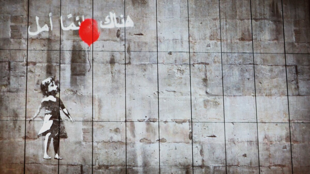 "Обновленная" картина знакомит зрителя с маленькой сирийской девочкой с платком на голове, от которой улетает красный шар в форме сердца.