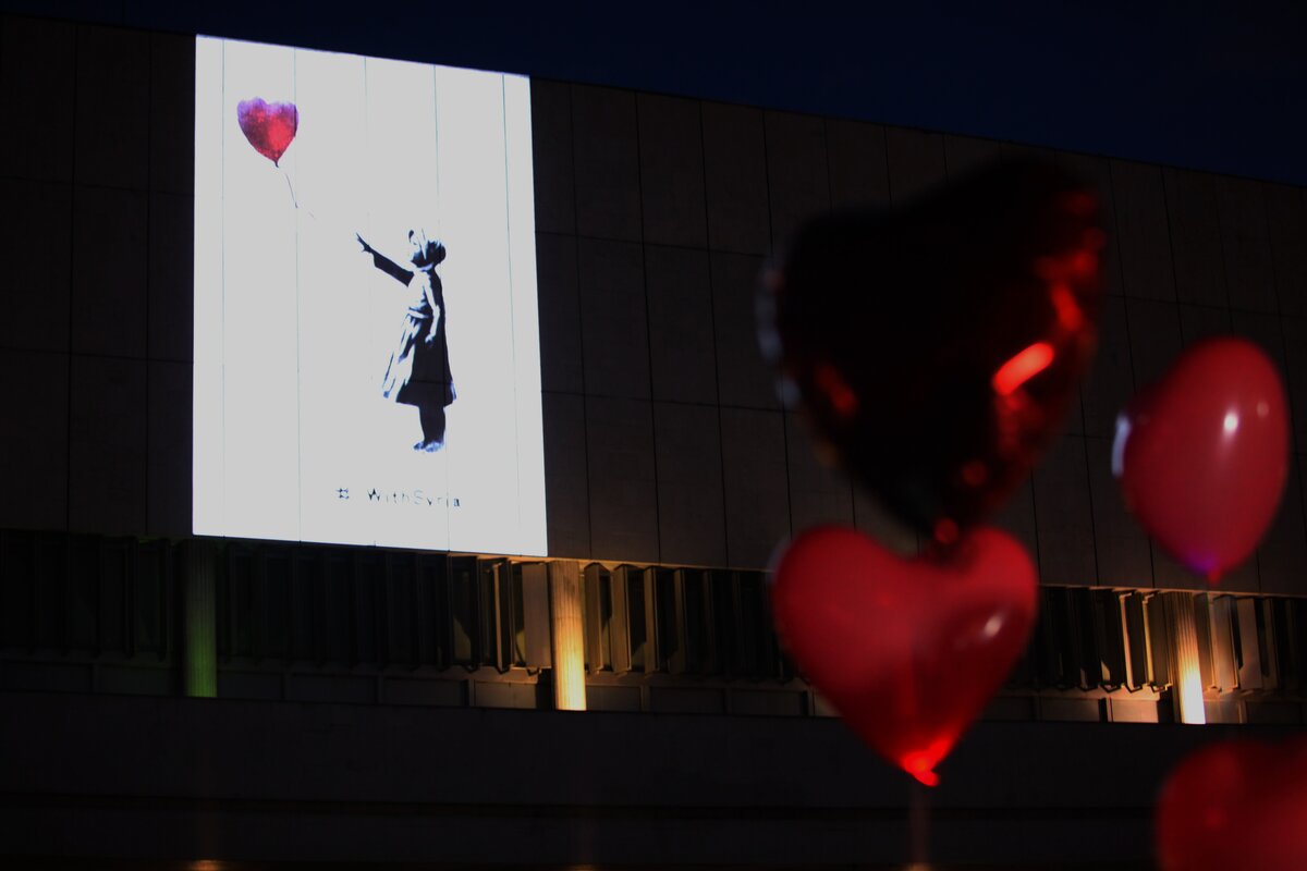 13 марта на стене Третьяковской галереи на Крымском валу представили 15-метровую проекцию новой версии работы стрит-арт художника Бэнкси "Девочка с шаром". Показ провели в рамках акции в поддержку сирийских детей-беженцев.