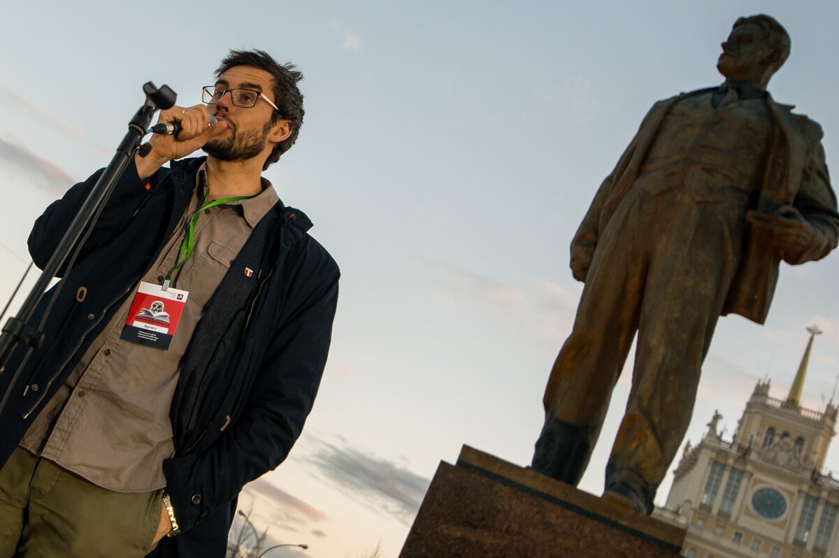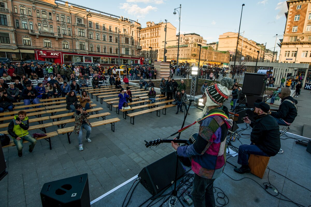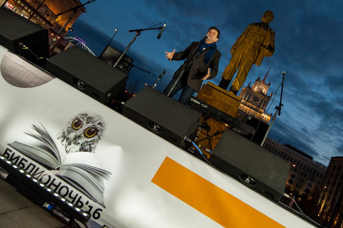 Главное действо "Библионочи" прошло на Триумфальной площади. Здесь установили мониторы, аудиоколонки и сцену. Для гостей праздника выступили известные и начинающие литераторы, актеры и музыканты, а на экранах транслировали выступления поэтов ХХ века, в том числе Евтушенко, Высоцкого и Ахмадулиной.