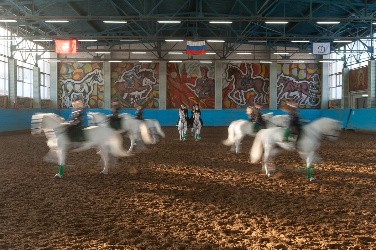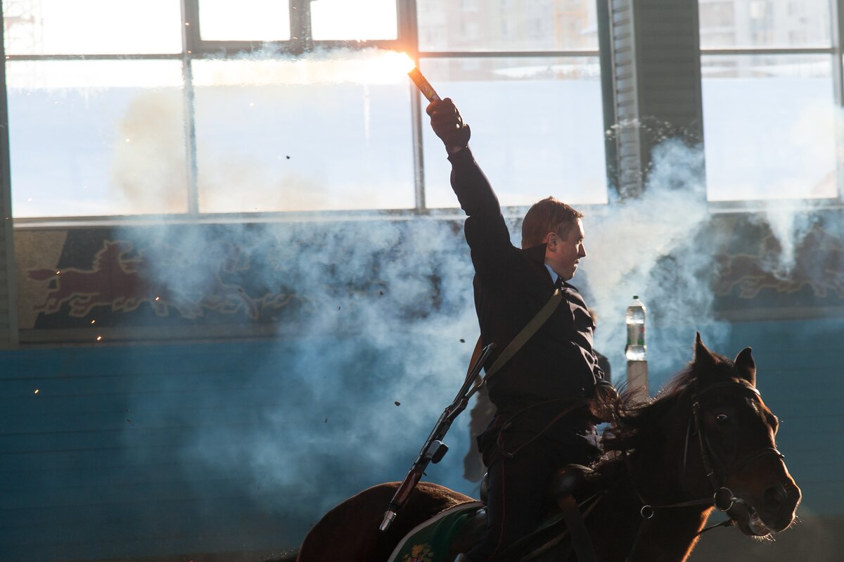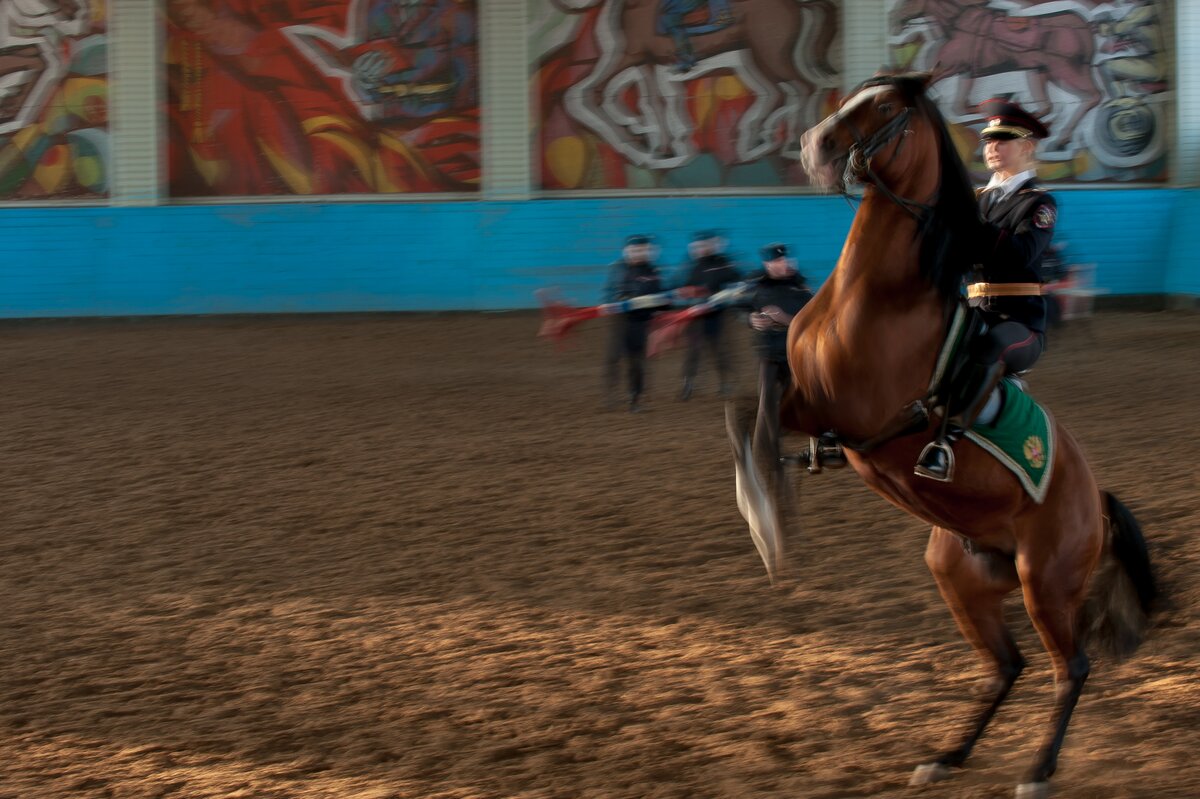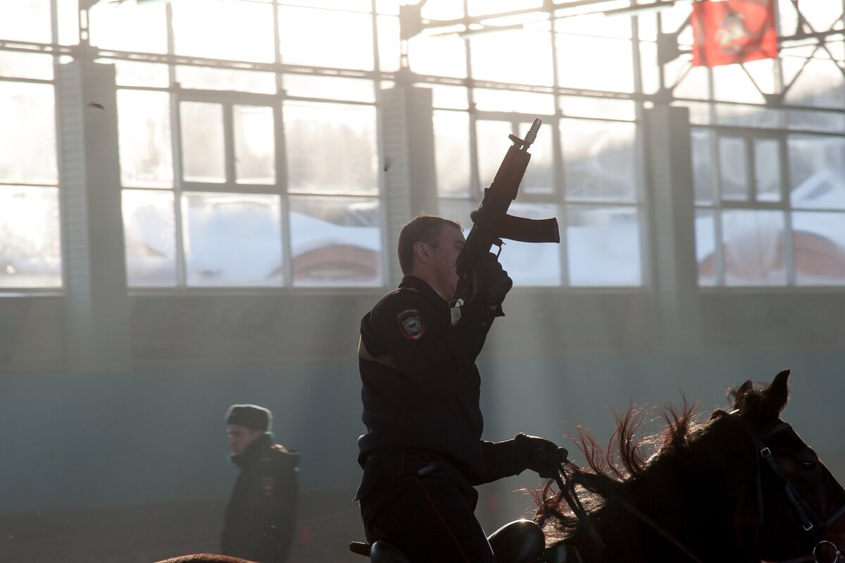 В манеже сотрудники первого Оперативного полка продемонстрировали навыки профессионального мастерства по различным видам конно-строевой подготовки и военно-прикладному конному искусству. Как это было, смотрите в фоторепортаже сетевого издания m24.ru