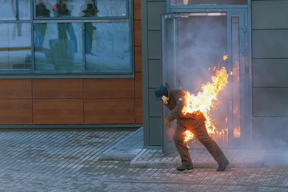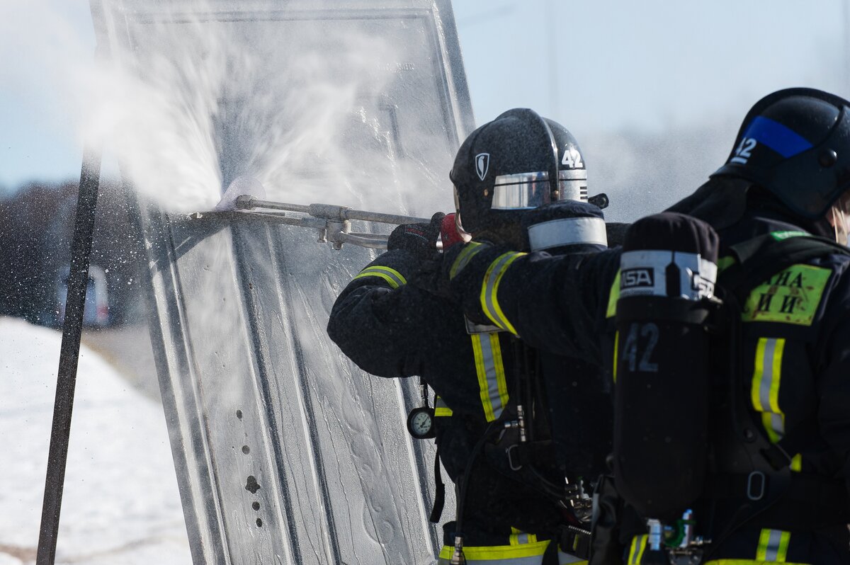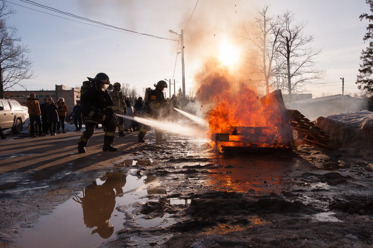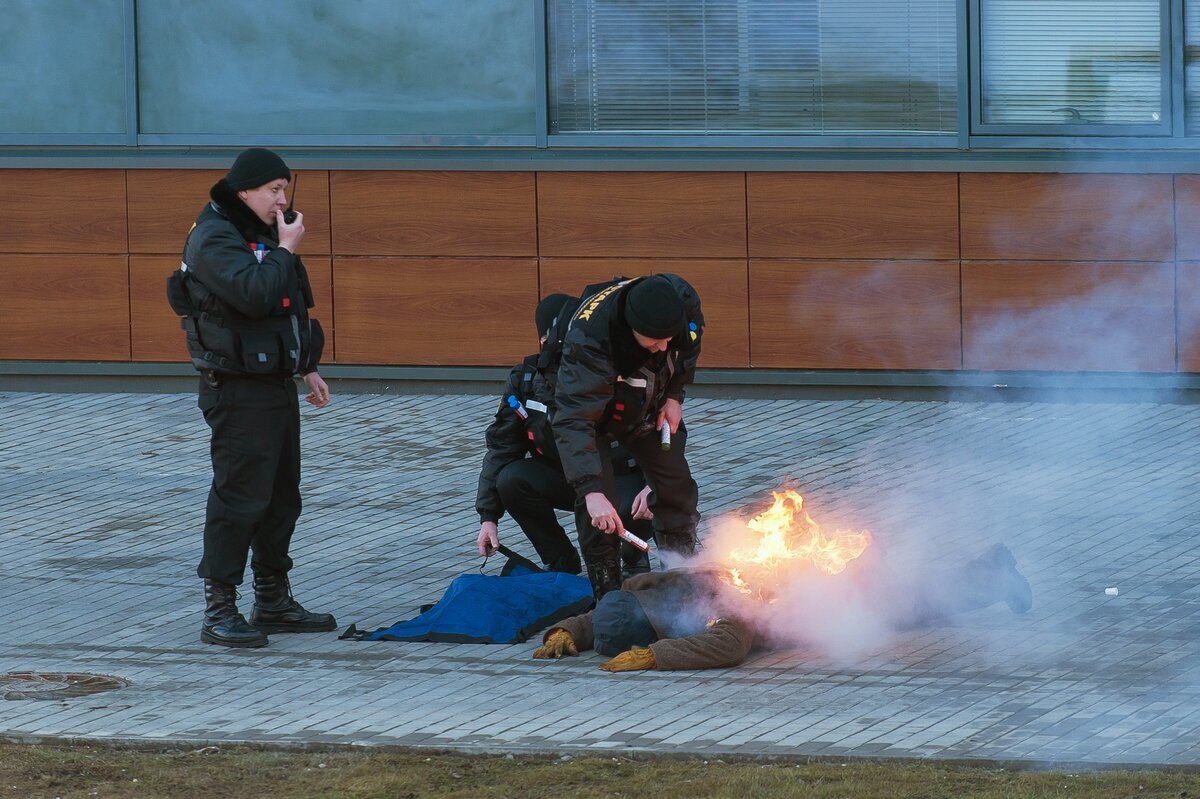 Спасатели инсценировали возникновение пожара, его ликвидацию и эвакуацию людей из помещения.