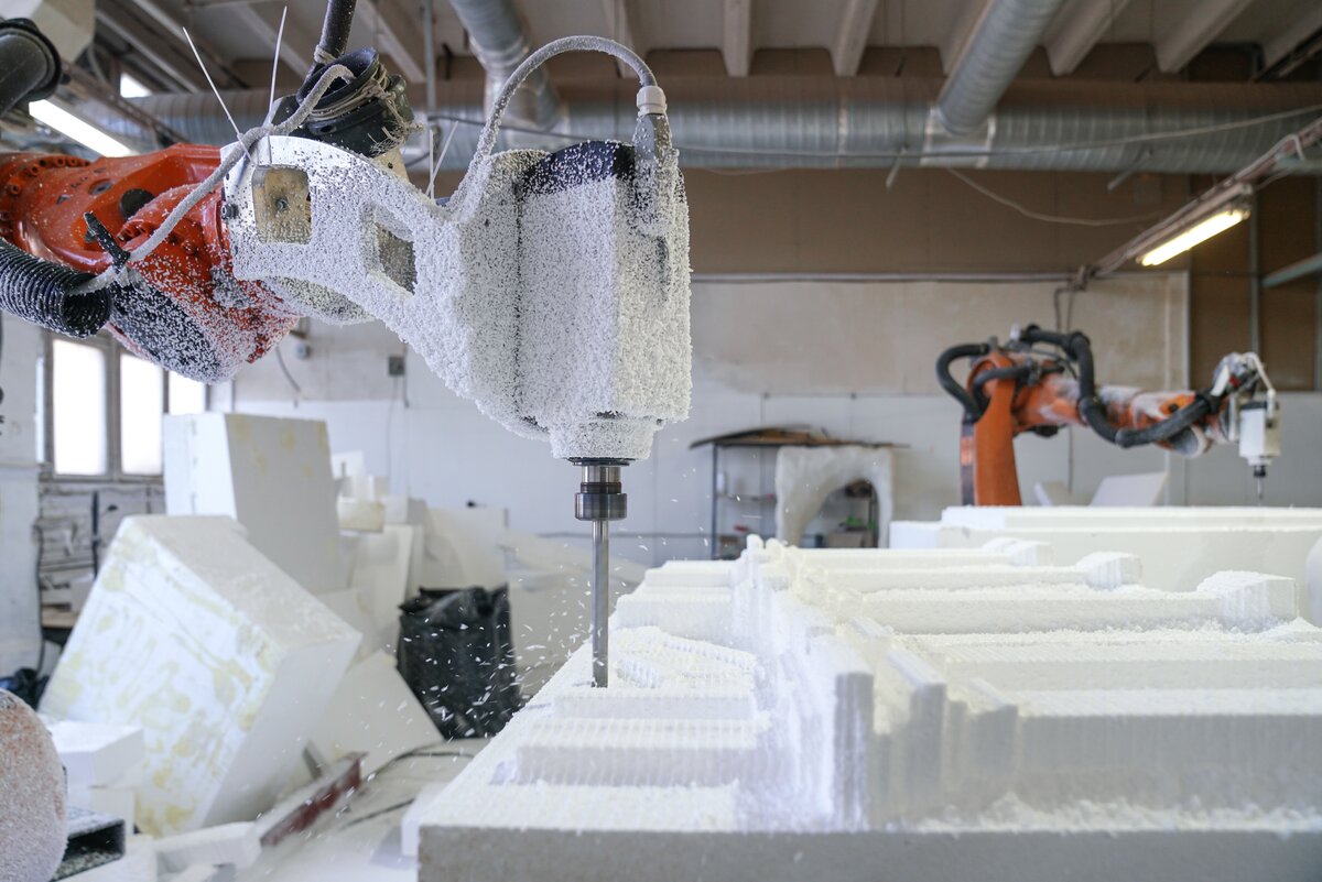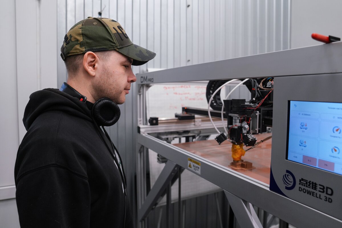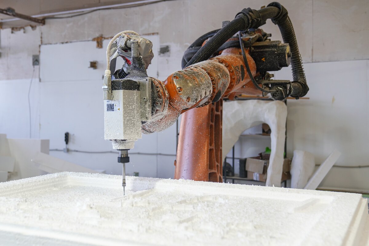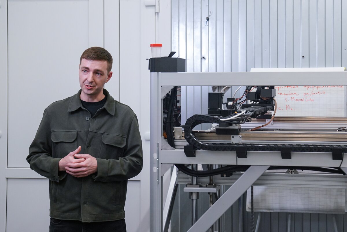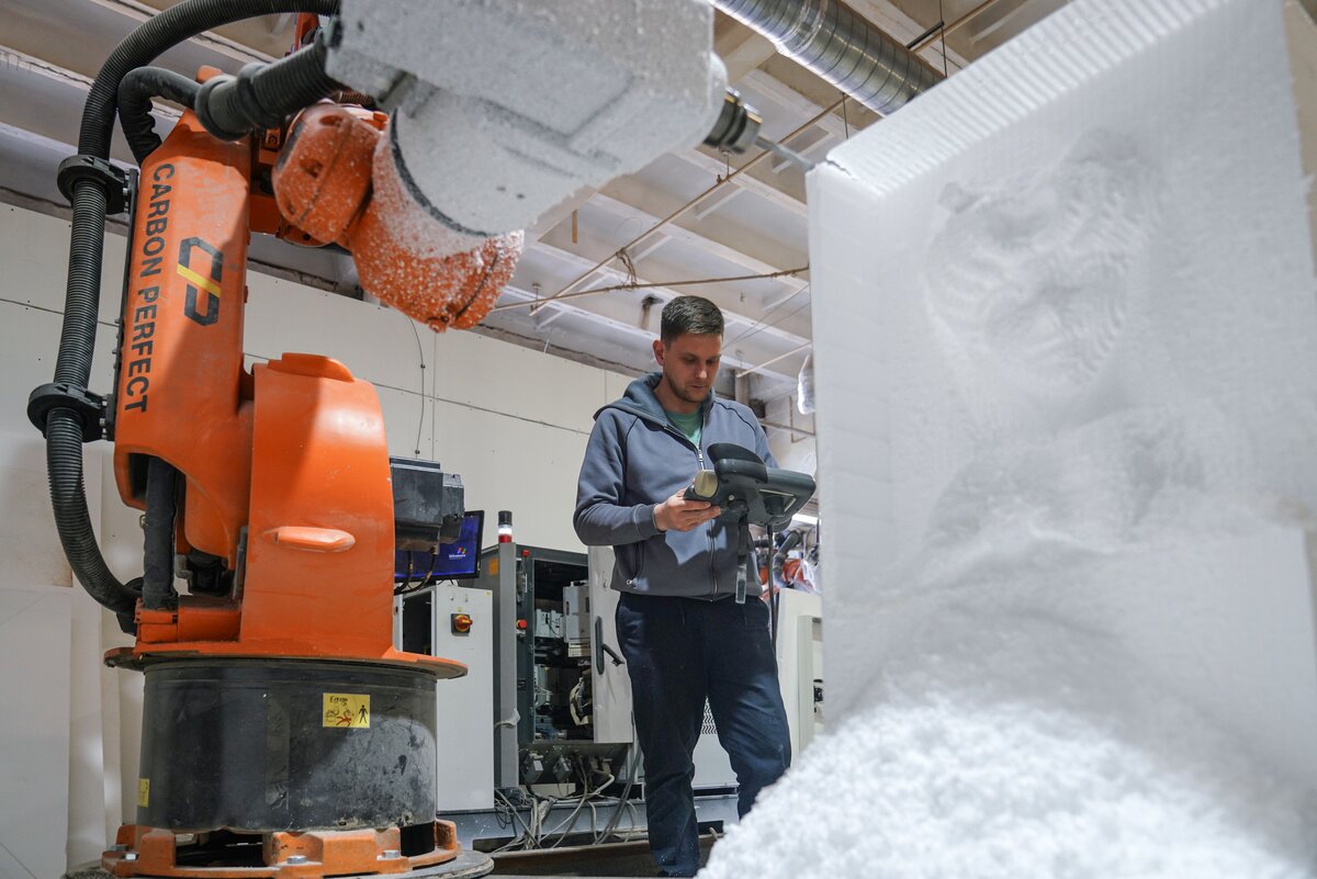 В мастерской с промышленным роботом гости увидели процесс создания скульптур и архитектурных форм по 3D-данным. Технология позволяет сократить сроки и ручной труд в 5–10 раз. После акселерации в "Академии инноваторов" команда получила крупный заказ от Театра Российской армии на изготовление декораций.