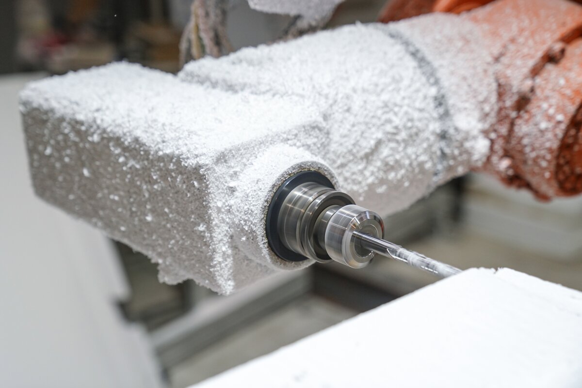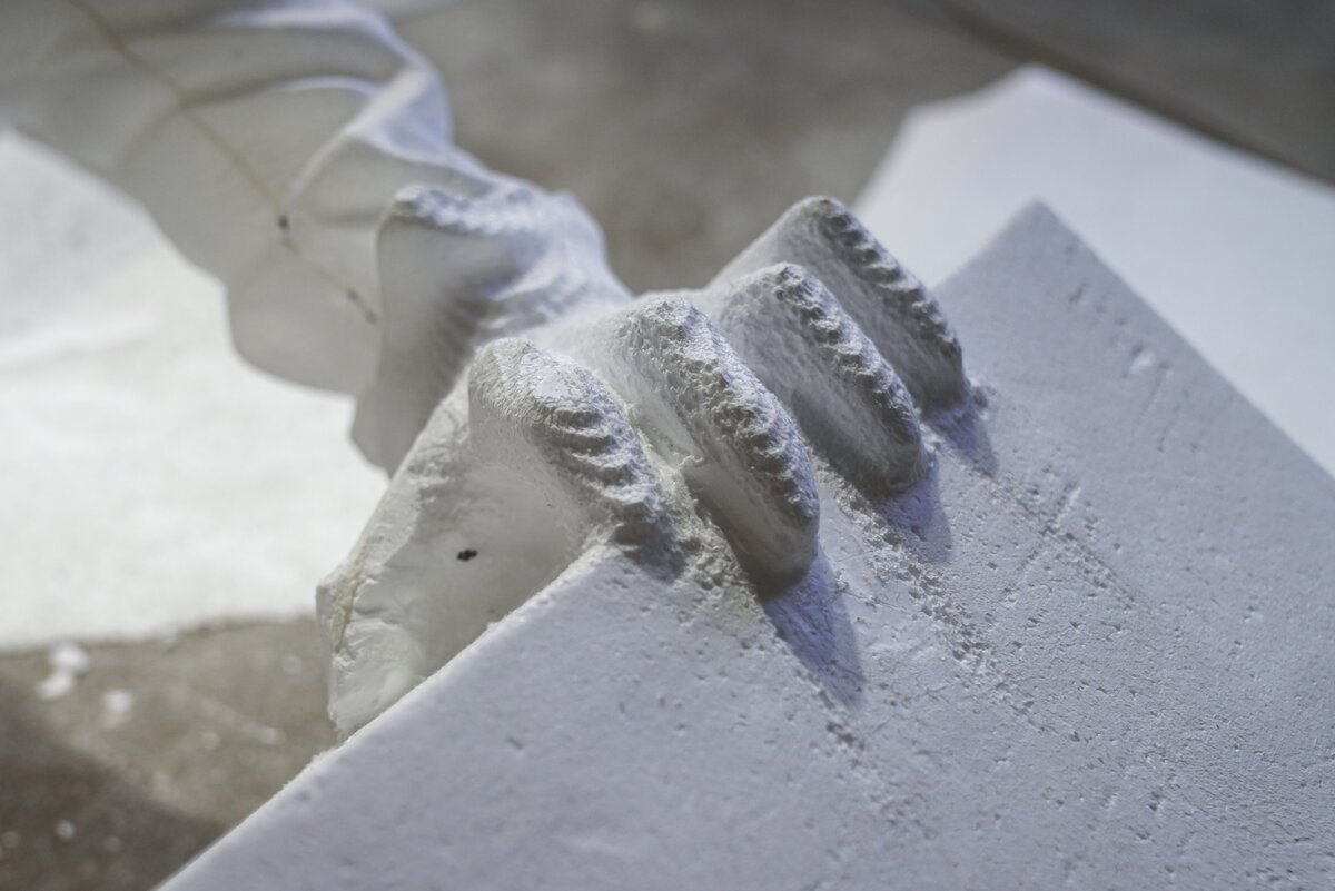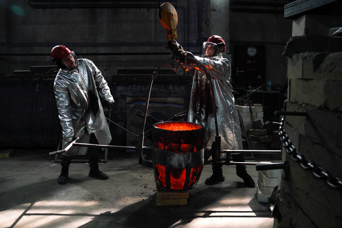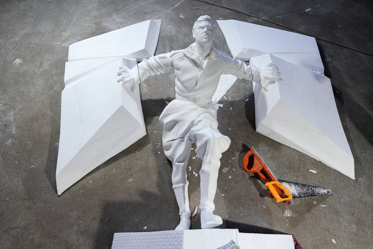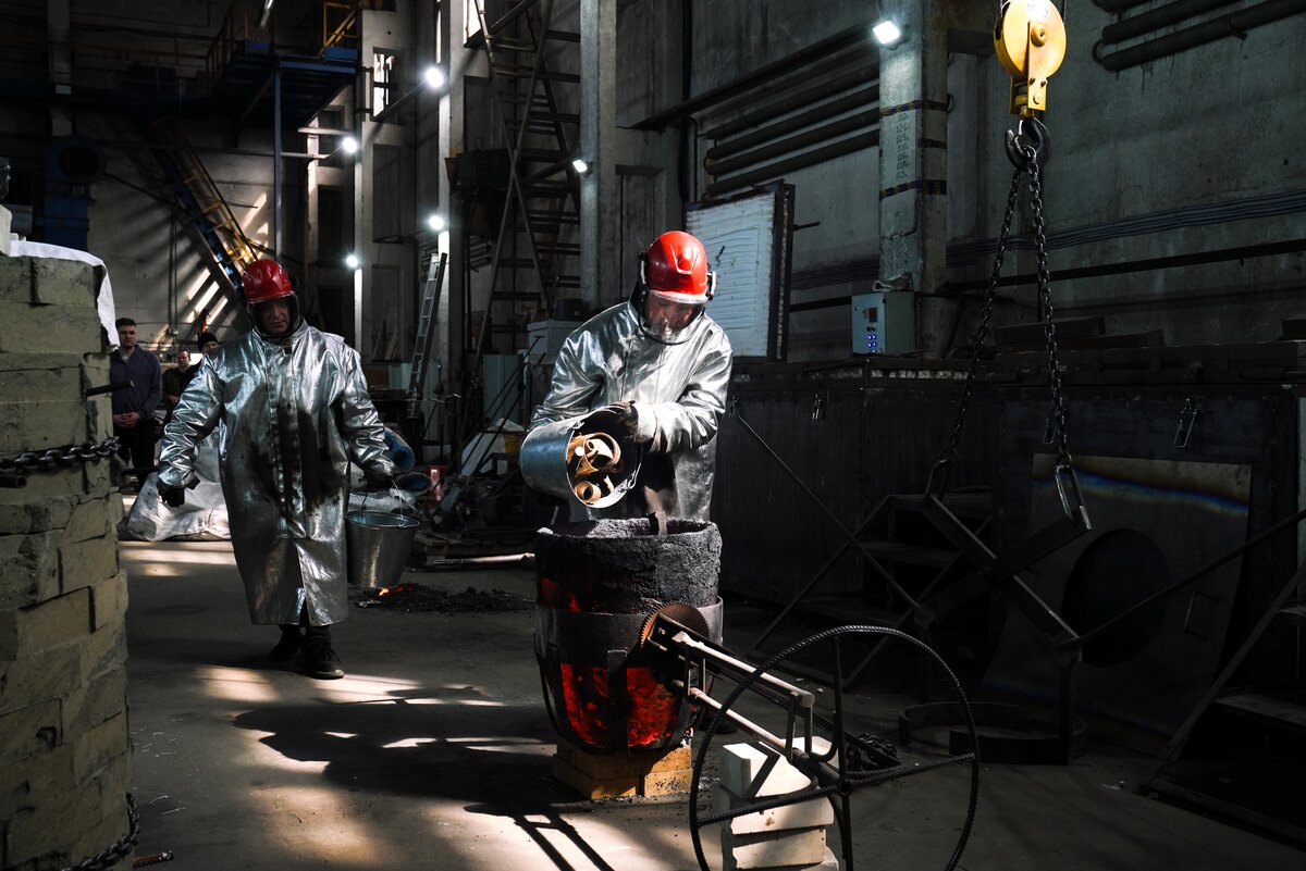 В мастерской с промышленным роботом гости увидели процесс создания скульптур и архитектурных форм по 3D-данным. Технология позволяет сократить сроки и ручной труд в 5–10 раз. После акселерации в "Академии инноваторов" команда получила крупный заказ от Театра Российской армии на изготовление декораций.
