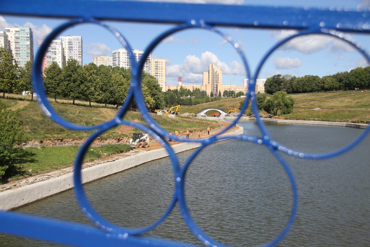 Сергей Собянин осмотрел ход работ по благоустройству парка в Олимпийской деревне. Их планируют завершить осенью.