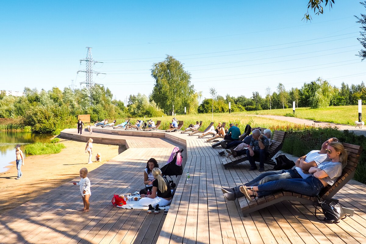 Возле пляжа обустроили двухуровневую "набережную" из деревянного настила, а также поставили лежаки. Теперь здесь можно загорать или просто принимать солнечные ванны. 8/16 Фото: портал Москва 24/Лидия ШиронинаФото: портал Москва 24/Лидия Широнина