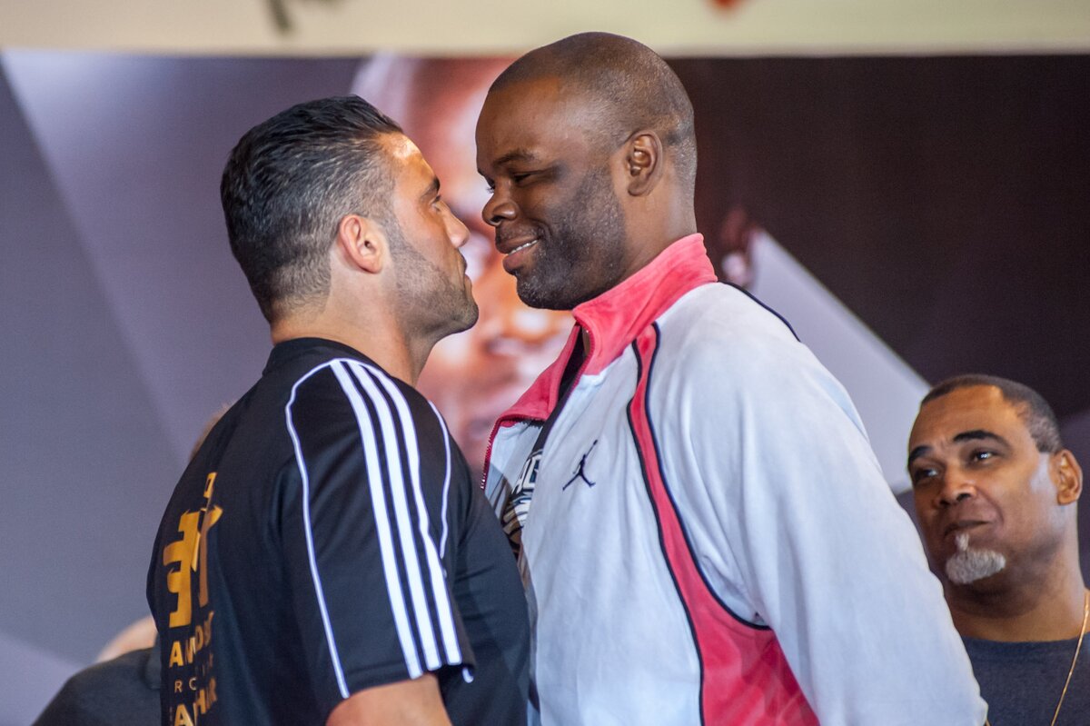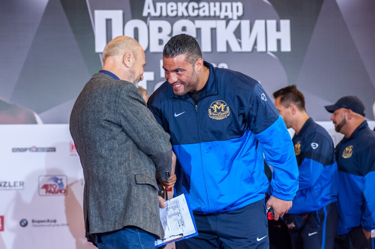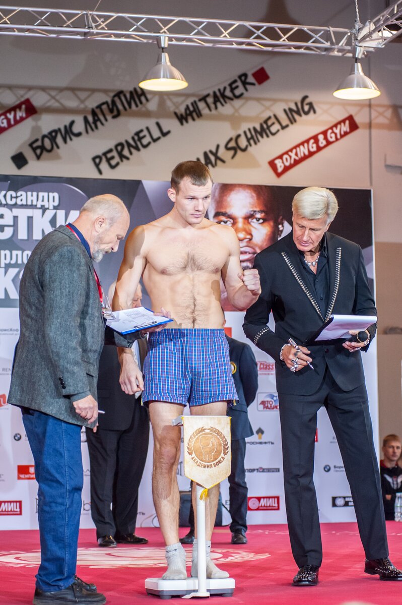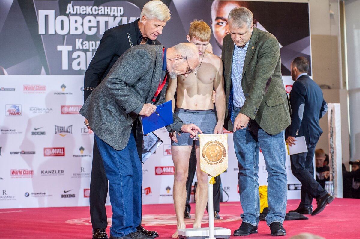 В академия бокса Boxing & Gym 23 сентября состоялась официальная процедура взвешивания перед поединками за звание чемпионов. За титул по версии WBC Silver в супертяжелом будут бороться друг с другом Александр Поветкин и Карлос Такама. Также участие во взвешивании приняли российские тяжеловес Рахим Чакхиев и легковес Эдуард Трояновский.