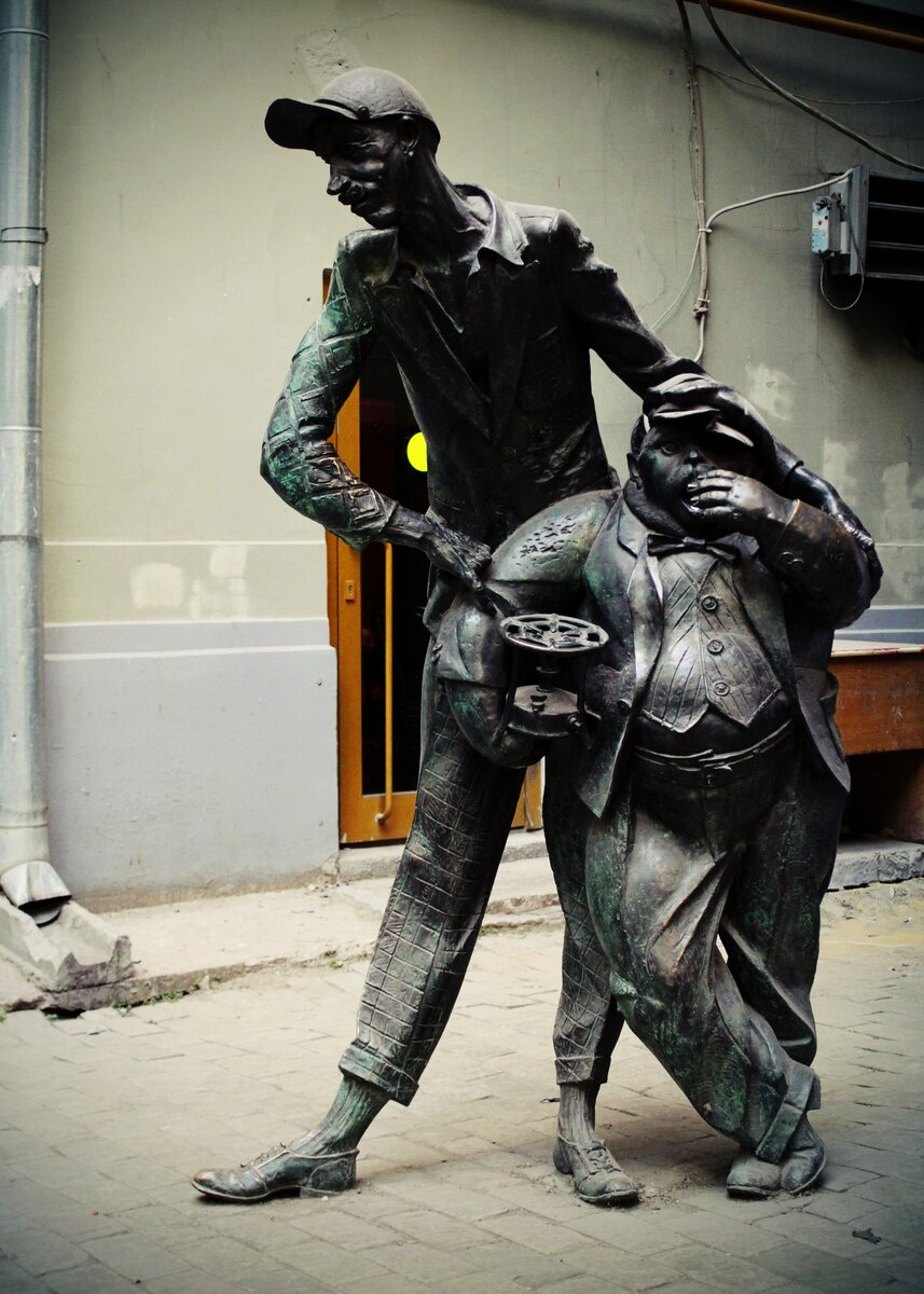Неразлучная парочка: клетчатый гражданин в жокейском картузе и невысокий толстяк с примусом (скульптор А. Рукавишников). Остальные изваяния героев «Мастера и Маргариты», пока не определено их место в городе, хранятся во дворике за мастерской писателя 21/23Неразлучная парочка: клетчатый гражданин в жокейском картузе и невысокий толстяк с примусом (скульптор А. Рукавишников). Остальные изваяния героев «Мастера и Маргариты», пока не определено их место в городе, хранятся во дворике за мастерской писателя