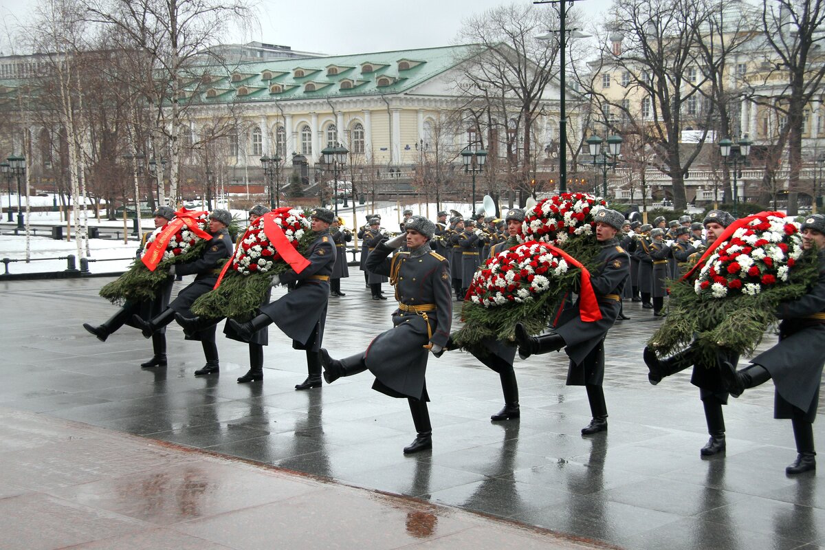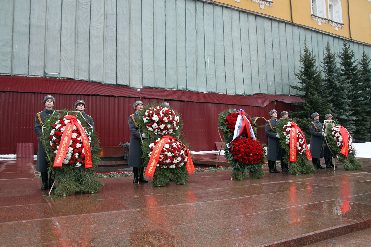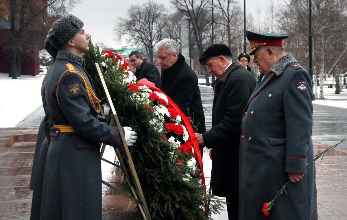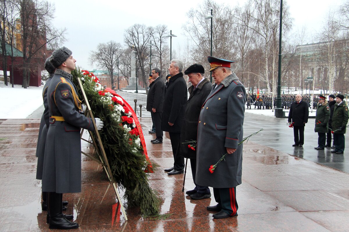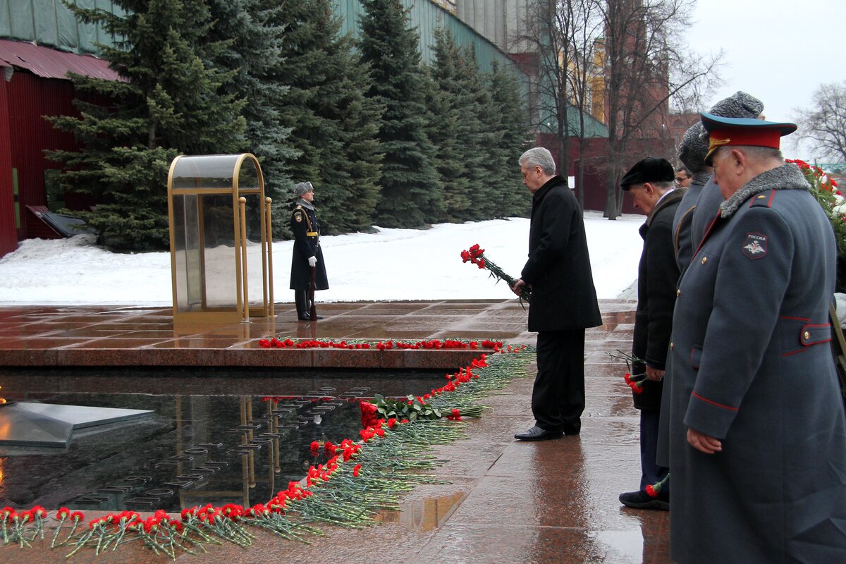 Мэр Москвы в День защитника Отечества возложил цветы и венки к Могиле Неизвестного Солдата в Александровском саду. В начале церемонии по традиции рота почетного караула вынесла четыре венка из еловых ветвей, украшенные цветами и опоясанные красными лентами, и установили их перед Вечным огнем.