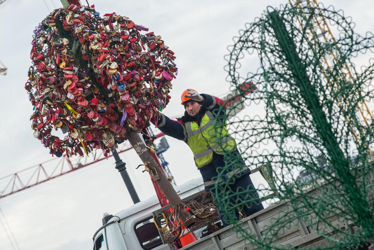Деревья с "замками любви" с Лужкова моста переместили на "Аллею любви" на набережной. В ГБУ "Гормост", чьи сотрудники демонтировали деревья, заверили, что ни один замок не пропал.