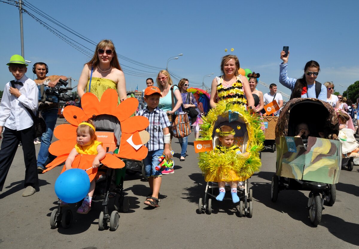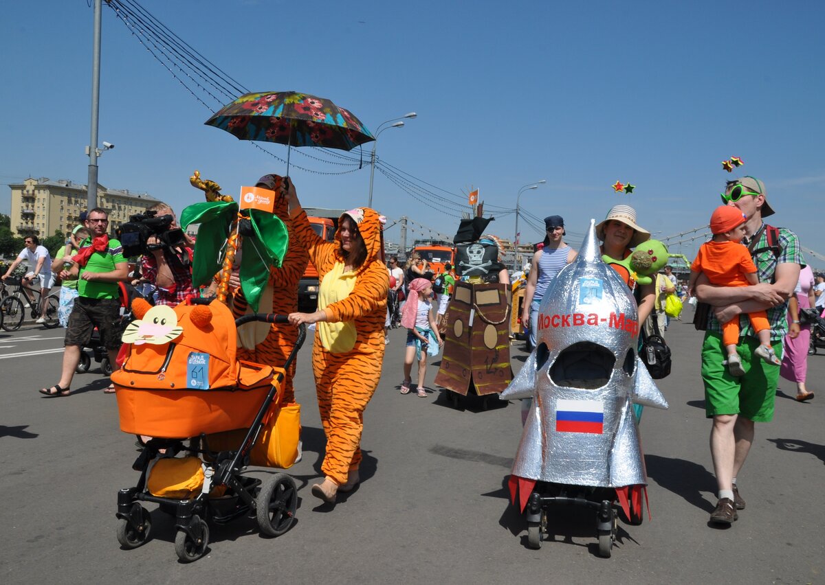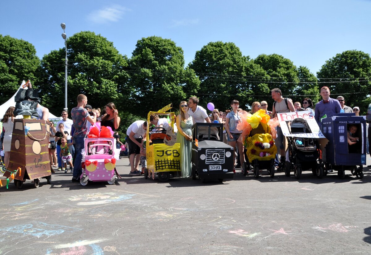 Парад колясок прошел в парке Горького в День защиты детей. Для участия в параде колясок нужно было зарегистрироваться на сайте и указать идею оформления своего детского транспорта. Всего было подано 114 заявок. Участники постарались, коляски получились смешными, красивыми и необычными. Дети ехали в космических кораблях, тыквах, вертолетах, троллейбусах и даже, как Емеля, на печи.