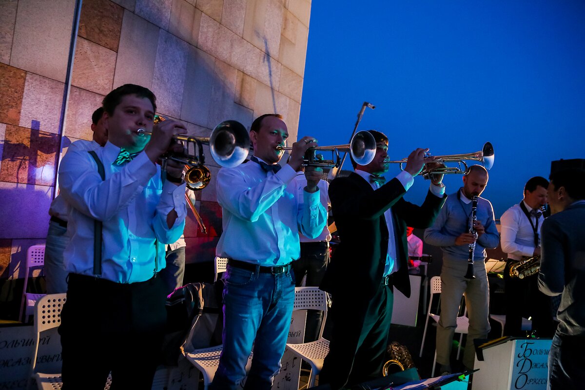 1 июня открылся летний сезон джазовых концертов на крыше "Рабочего и колхозницы". Большой джазовый оркестр выступил с программой "Вечные мелодии ушедшей эры джаза".