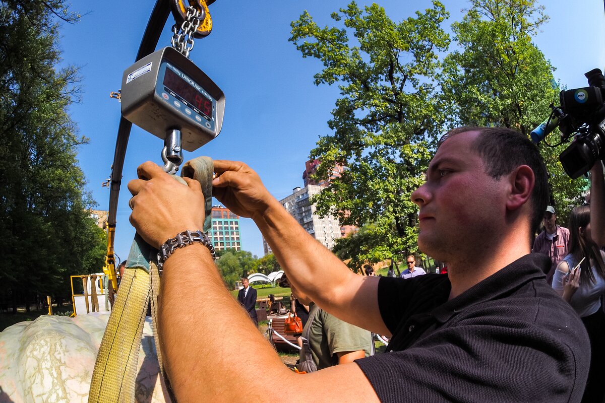 В среду, 5 сентября, в Ботанический сад МГУ "Аптекарский огород" привезли самую большую тыкву в России. Ее взвесили для Книги рекордов России и устроили фотосессию.