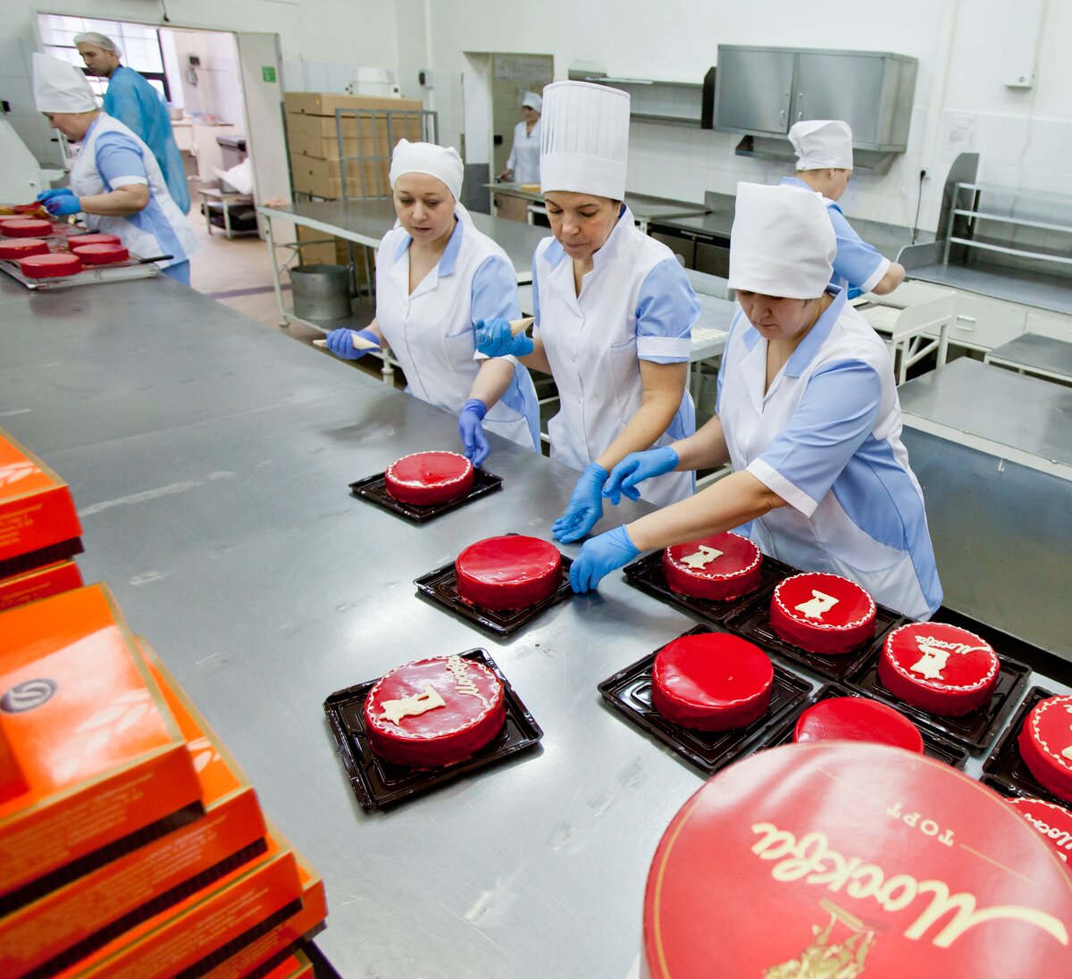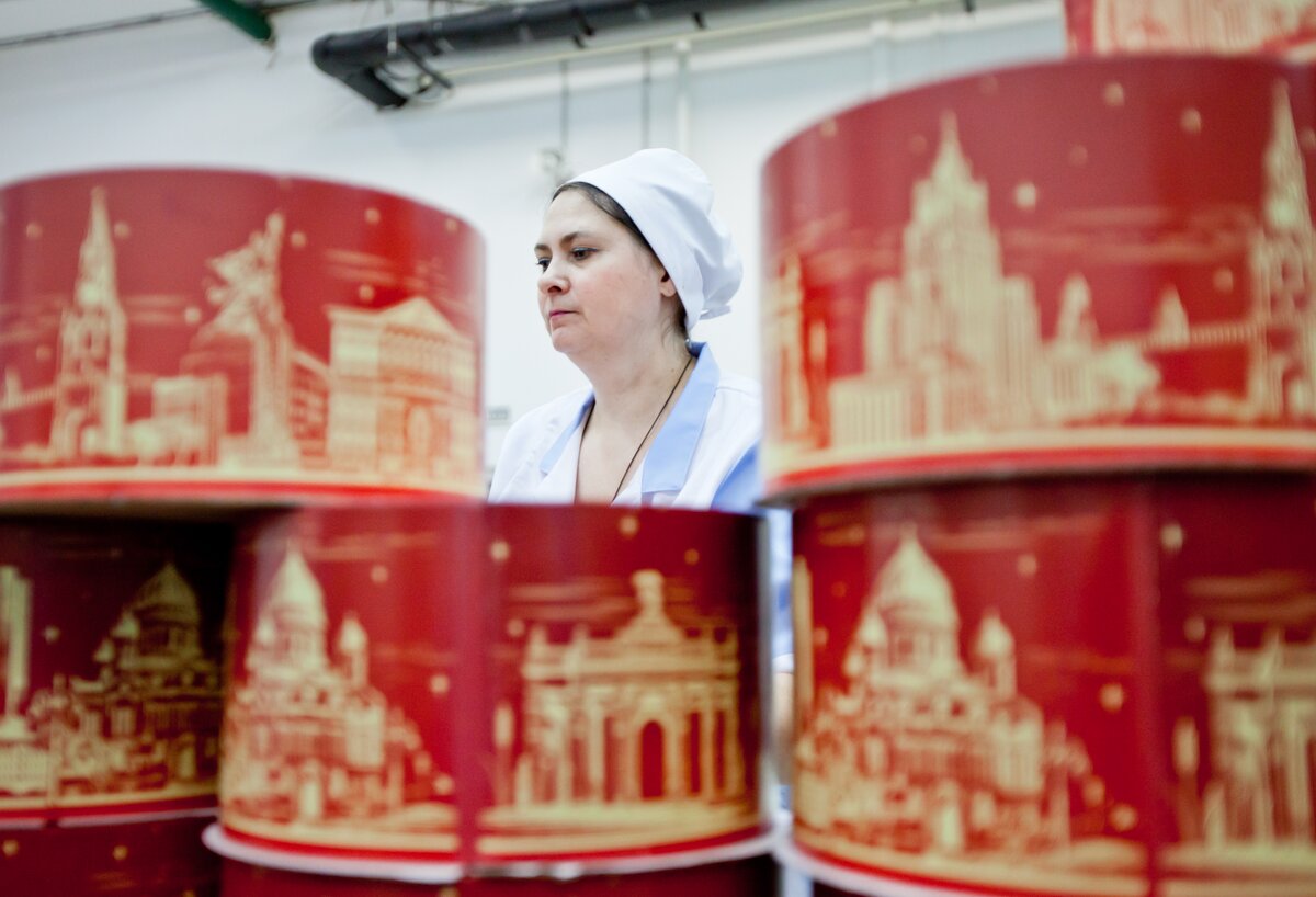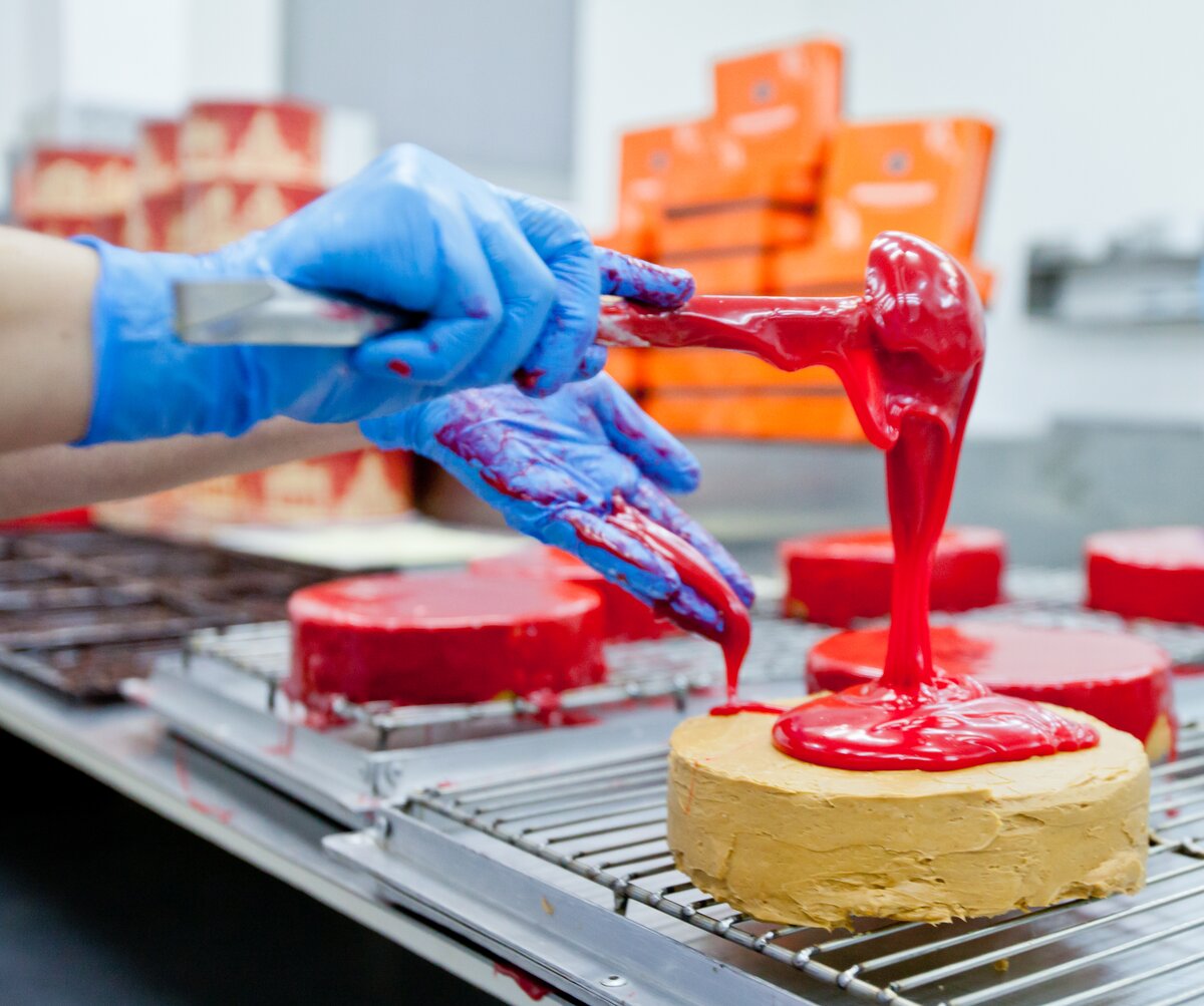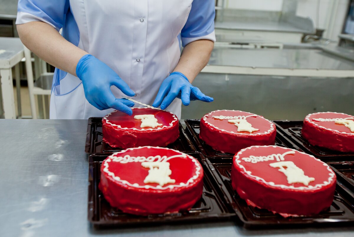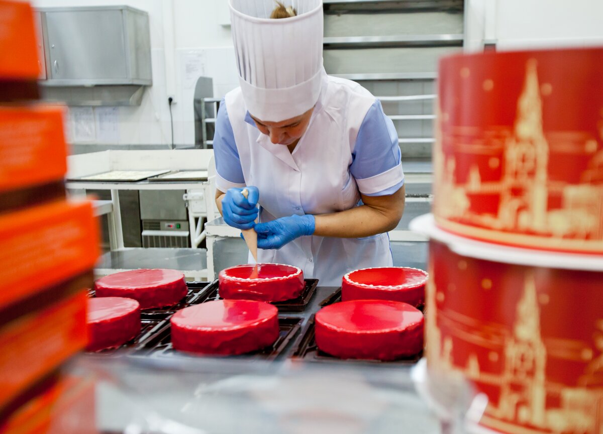 Фотокорреспонденты m24.ru побывали в цехе, где растекается по ореховым коржам вареная сгущенка и размазывается красная глазурь, чтобы узнать, как создают главный десерт.