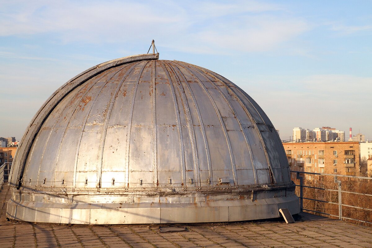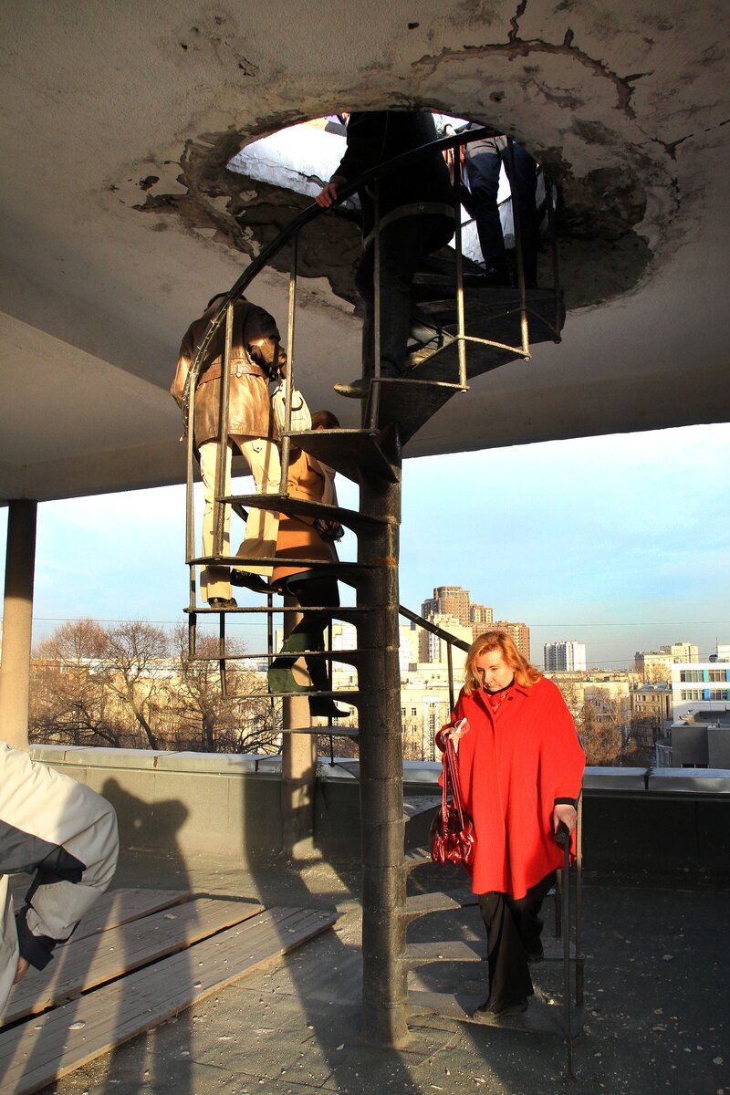 К сожалению, она пока не работает - заклинило раздвижной купол, но подняться на крышу и увидеть прекрасный вид на Москву можно на экскурсии, которые по памятнику архитектуры 1930-х годов проводит кандидат политических наук, куратор проекта СОВАРХ Денис Ромодин.