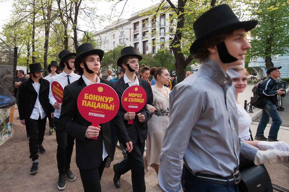Для участников шествия также были приготовлены цилиндры и таблички с известными фразами из произведений Пушкина.