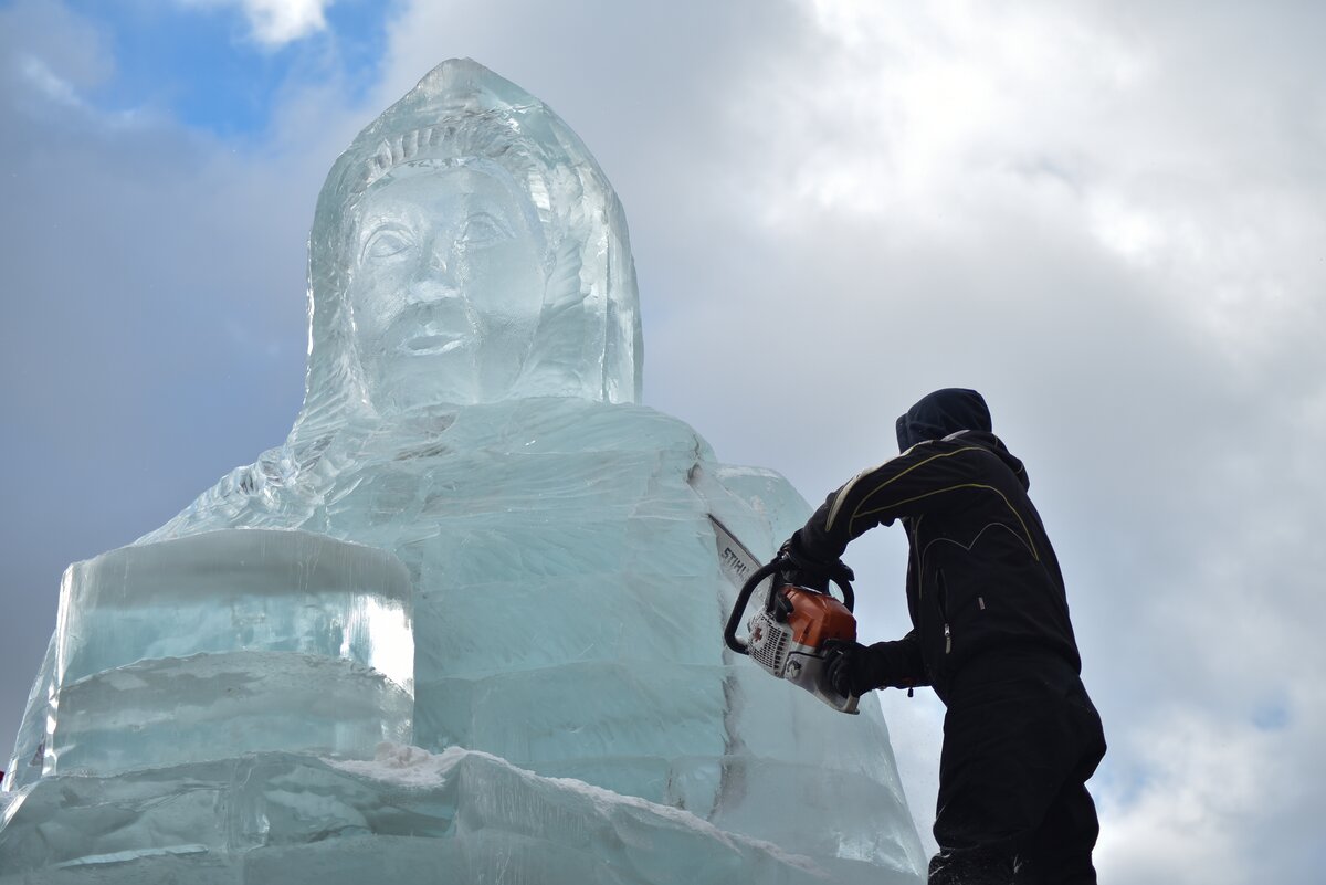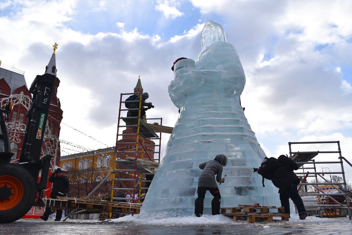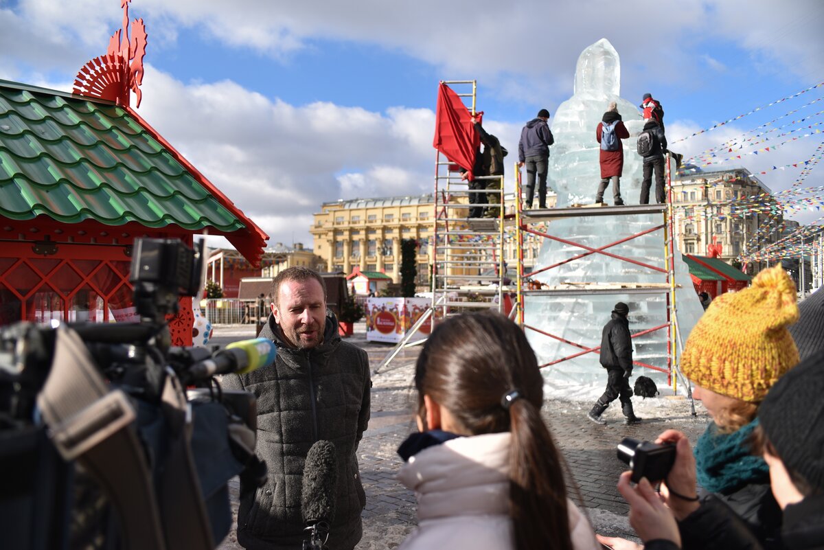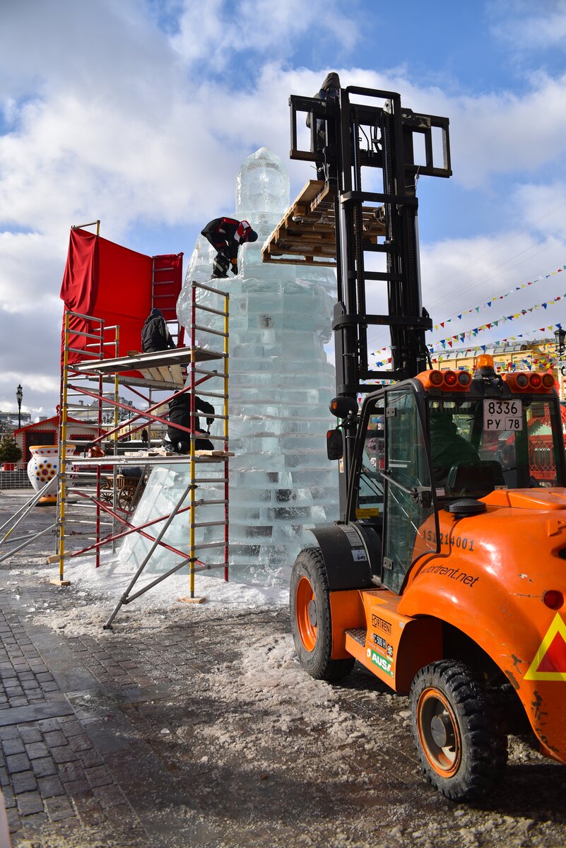 К фестивалю "Московская Масленица" художники создали один из самых впечатляющие арт-объектов. Посмотреть за созданием восьмиметровой ледяной фигуры Масленицы можно было 15 февраля. Над созданием скульптуры, на которую ушло более 30 тонн чистейшего льда из озер Первоуральска, трудились одновременно пять художников.
