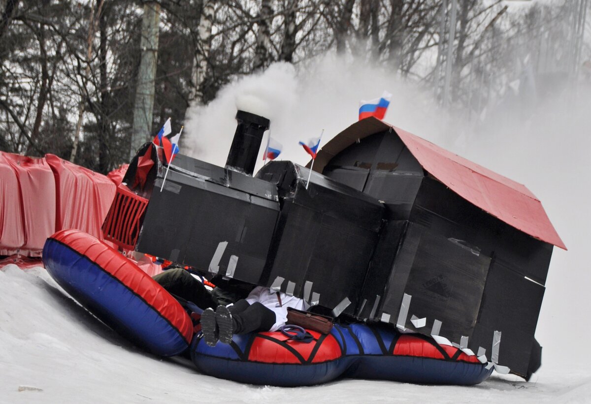 В парке "Сокольники" прошел фестиваль необычных саней "Battle Сани". Все желающие могли покататься на санях собственного изготовления на 200-метровой "The Горке".