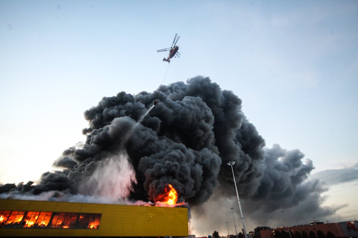 Торговый центр "Синдика" загорелся 8 октября. Огонь вспыхнул на складе и распространился на подземную парковку. Сначала площадь возгорания составила 1 тысячу квадратных метров, затем достигла 55 тысяч квадратных метров. Потушить пожар удалось лишь к утру следующего дня. В его ликвидации участвовали три вертолета. Пострадали три человека, которые отравились угарным газом. Потери собственников "Синдики" составили около 4 миллиардов рублей. После происшествия владельцы сгоревшего ТЦ решили построить на его месте новый комплекс. Причиной пожара стал поджог. Делом занимаются полицейские. Фото: АГН Москва/Ведяшкин Сергей.